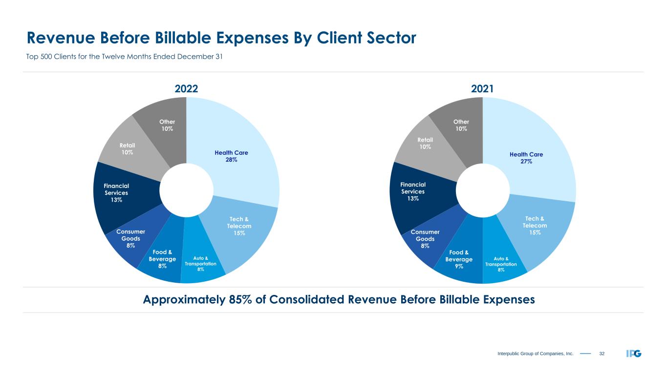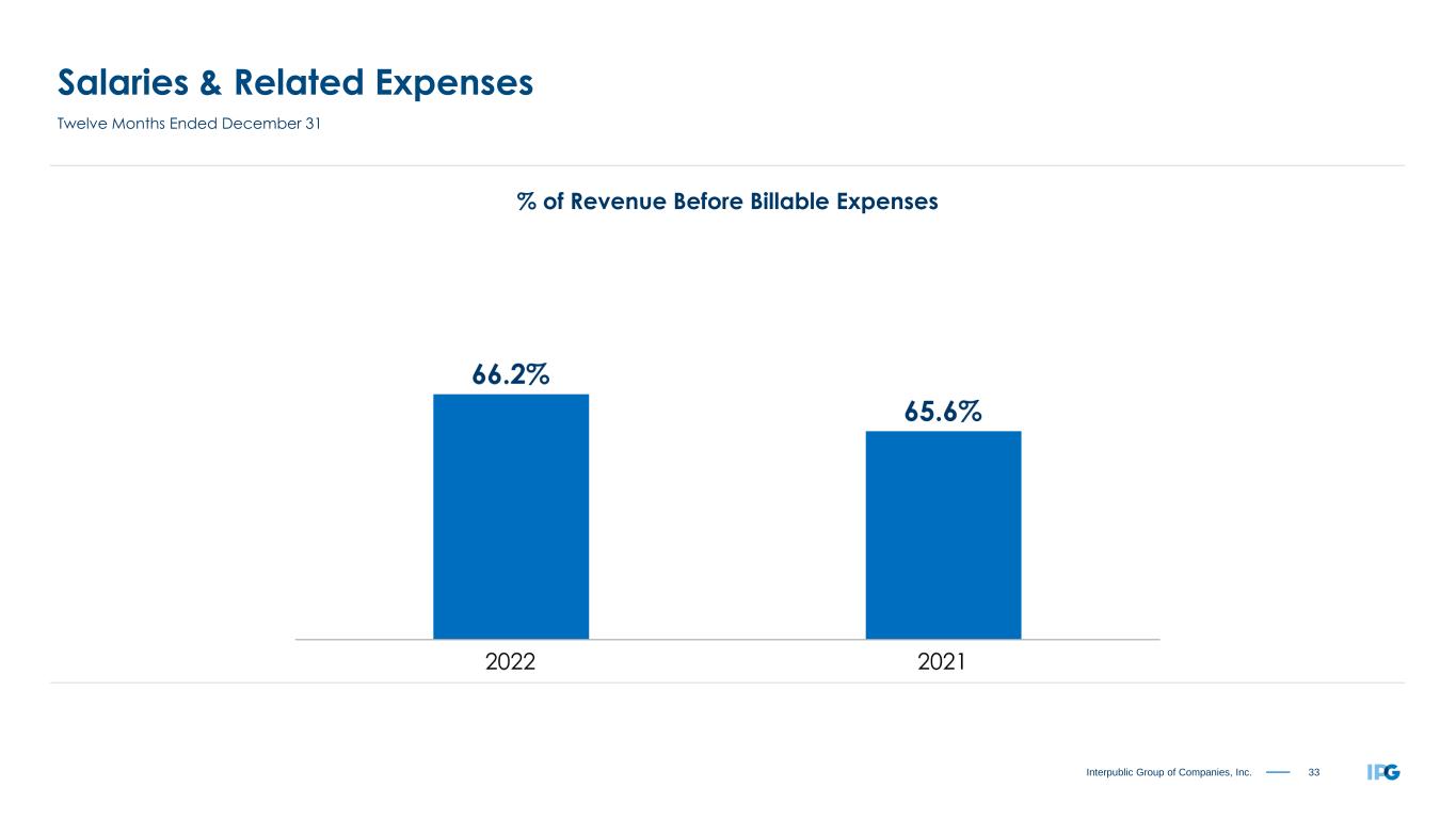 32Interpublic Group of Companies, Inc. Revenue Before Billable Expenses By Client Sector Top 500 Clients for the Twelve Months Ended December 31 Approximately 85% of Consolidated Revenue Before Billable Expenses (1) 2022 2021 Health Care 28% Tech & Telecom 15% Auto & Transportation 8% Food & Beverage 8% Consumer Goods 8% Financial Services 13% Retail 10% Other 10% Health Care 27% Tech & Telecom 15% Auto & Transportation 8% Food & Beverage 9% Consumer Goods 8% Financial Services 13% Retail 10% Other 10%