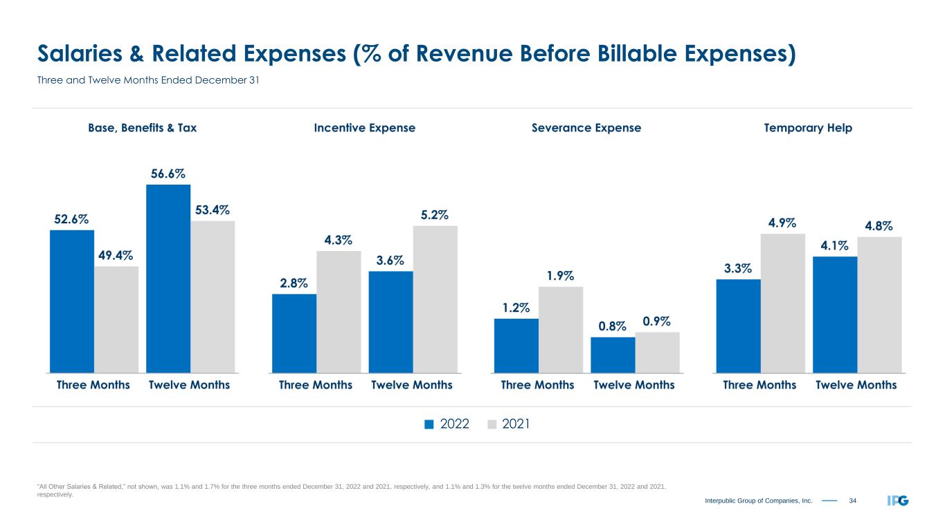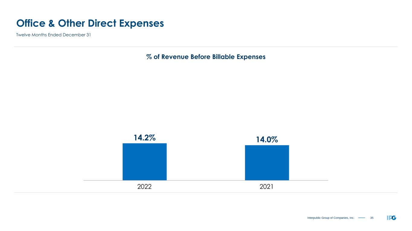 34Interpublic Group of Companies, Inc. Salaries & Related Expenses (% of Revenue Before Billable Expenses) “All Other Salaries & Related,” not shown, was 1.1% and 1.7% for the three months ended December 31, 2022 and 2021, respectively, and 1.1% and 1.3% for the twelve months ended December 31, 2022 and 2021, respectively. Three and Twelve Months Ended December 31 2022 2021