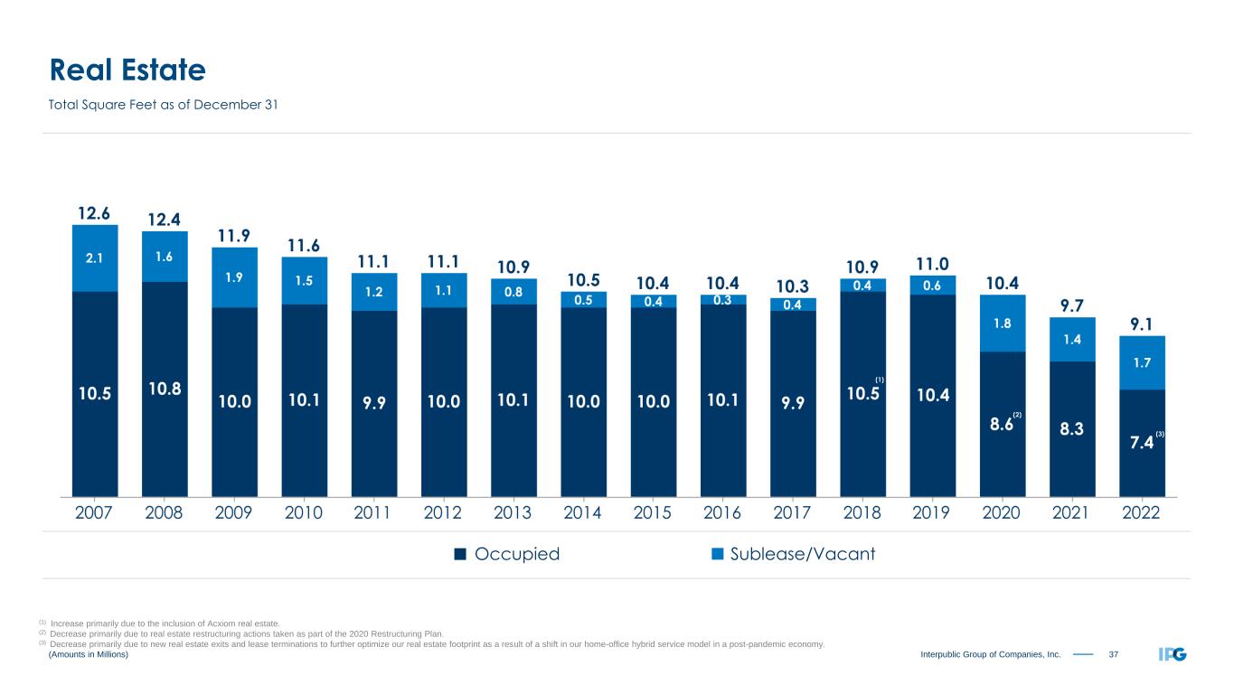 37Interpublic Group of Companies, Inc. (Amounts in Millions) Real Estate Total Square Feet as of December 31 Sublease/VacantOccupied (1) Increase primarily due to the inclusion of Acxiom real estate. (2) Decrease primarily due to real estate restructuring actions taken as part of the 2020 Restructuring Plan. (3) Decrease primarily due to new real estate exits and lease terminations to further optimize our real estate footprint as a result of a shift in our home-office hybrid service model in a post-pandemic economy. (1) (2) (3)