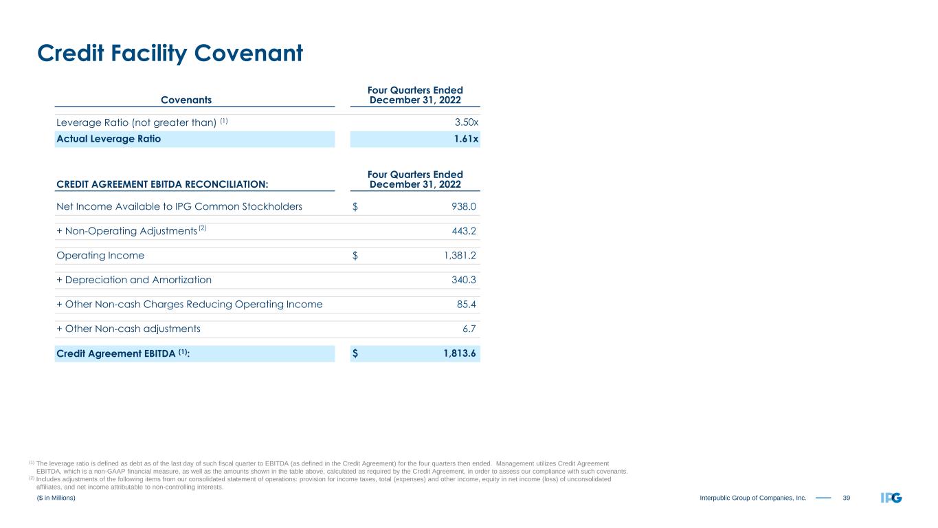 39Interpublic Group of Companies, Inc. Covenants Four Quarters Ended December 31, 2022 Leverage Ratio (not greater than) (1) 3.50x Actual Leverage Ratio 1.61x CREDIT AGREEMENT EBITDA RECONCILIATION: Four Quarters Ended December 31, 2022 Net Income Available to IPG Common Stockholders $ 938.0 + Non-Operating Adjustments 443.2 Operating Income $ 1,381.2 + Depreciation and Amortization 340.3 + Other Non-cash Charges Reducing Operating Income 85.4 + Other Non-cash adjustments 6.7 Credit Agreement EBITDA (1): $ 1,813.6 ($ in Millions) Credit Facility Covenant (1) The leverage ratio is defined as debt as of the last day of such fiscal quarter to EBITDA (as defined in the Credit Agreement) for the four quarters then ended. Management utilizes Credit Agreement EBITDA, which is a non-GAAP financial measure, as well as the amounts shown in the table above, calculated as required by the Credit Agreement, in order to assess our compliance with such covenants. (2) Includes adjustments of the following items from our consolidated statement of operations: provision for income taxes, total (expenses) and other income, equity in net income (loss) of unconsolidated affiliates, and net income attributable to non-controlling interests. (2)