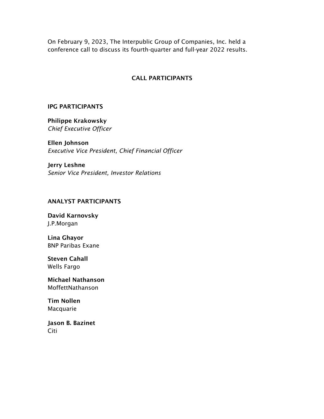 On February 9, 2023, The Interpublic Group of Companies, Inc. held a conference call to discuss its fourth-quarter and full-year 2022 results. CALL PARTICIPANTS IPG PARTICIPANTS Philippe Krakowsky Chief Executive Officer Ellen Johnson Executive Vice President, Chief Financial Officer Jerry Leshne Senior Vice President, Investor Relations ANALYST PARTICIPANTS David Karnovsky J.P.Morgan Lina Ghayor BNP Paribas Exane Steven Cahall Wells Fargo Michael Nathanson MoffettNathanson Tim Nollen Macquarie Jason B. Bazinet Citi