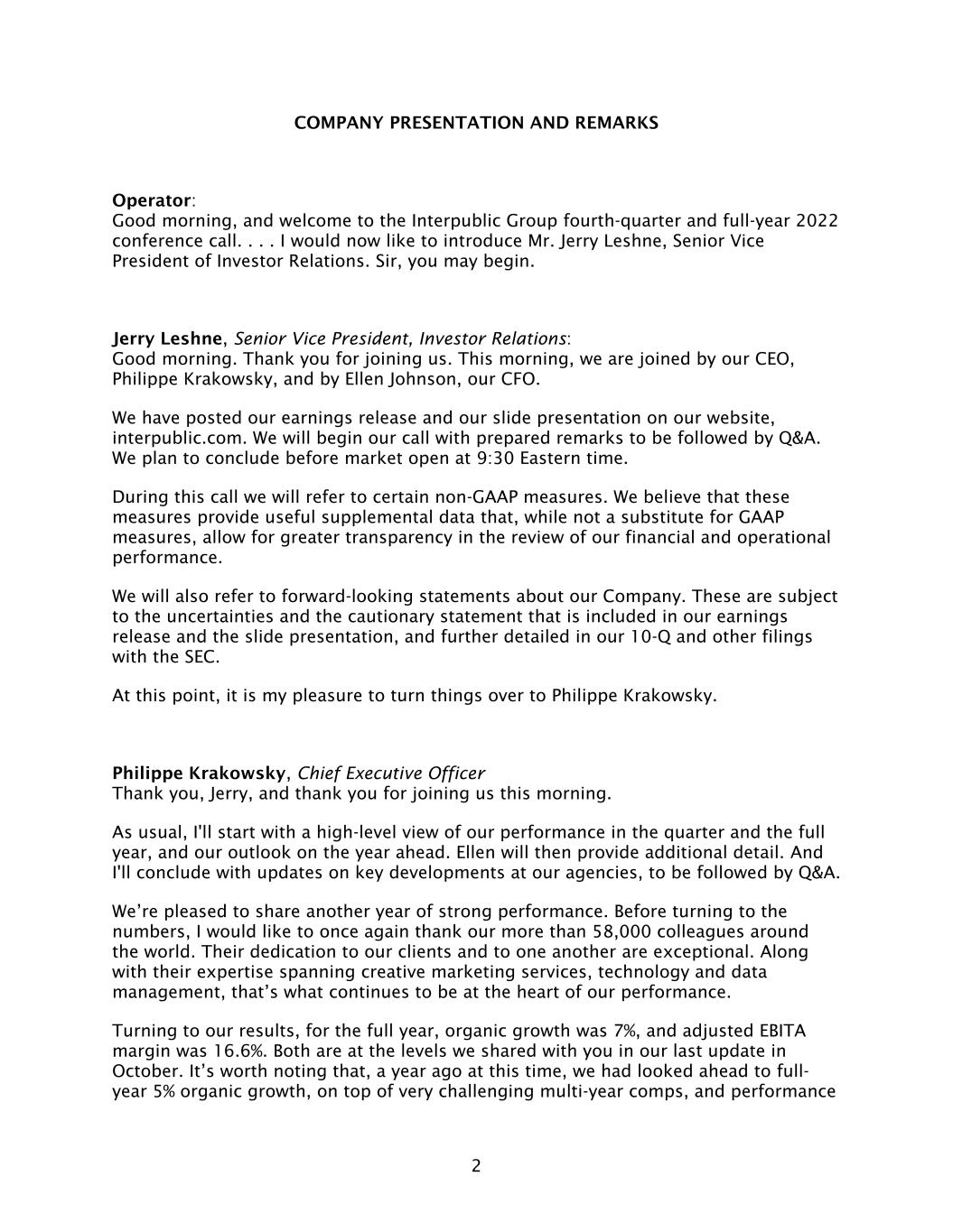 2 COMPANY PRESENTATION AND REMARKS Operator: Good morning, and welcome to the Interpublic Group fourth-quarter and full-year 2022 conference call. . . . I would now like to introduce Mr. Jerry Leshne, Senior Vice President of Investor Relations. Sir, you may begin. Jerry Leshne, Senior Vice President, Investor Relations: Good morning. Thank you for joining us. This morning, we are joined by our CEO, Philippe Krakowsky, and by Ellen Johnson, our CFO. We have posted our earnings release and our slide presentation on our website, interpublic.com. We will begin our call with prepared remarks to be followed by Q&A. We plan to conclude before market open at 9:30 Eastern time. During this call we will refer to certain non-GAAP measures. We believe that these measures provide useful supplemental data that, while not a substitute for GAAP measures, allow for greater transparency in the review of our financial and operational performance. We will also refer to forward-looking statements about our Company. These are subject to the uncertainties and the cautionary statement that is included in our earnings release and the slide presentation, and further detailed in our 10-Q and other filings with the SEC. At this point, it is my pleasure to turn things over to Philippe Krakowsky. Philippe Krakowsky, Chief Executive Officer Thank you, Jerry, and thank you for joining us this morning. As usual, I'll start with a high-level view of our performance in the quarter and the full year, and our outlook on the year ahead. Ellen will then provide additional detail. And I'll conclude with updates on key developments at our agencies, to be followed by Q&A. We’re pleased to share another year of strong performance. Before turning to the numbers, I would like to once again thank our more than 58,000 colleagues around the world. Their dedication to our clients and to one another are exceptional. Along with their expertise spanning creative marketing services, technology and data management, that’s what continues to be at the heart of our performance. Turning to our results, for the full year, organic growth was 7%, and adjusted EBITA margin was 16.6%. Both are at the levels we shared with you in our last update in October. It’s worth noting that, a year ago at this time, we had looked ahead to full- year 5% organic growth, on top of very challenging multi-year comps, and performance
