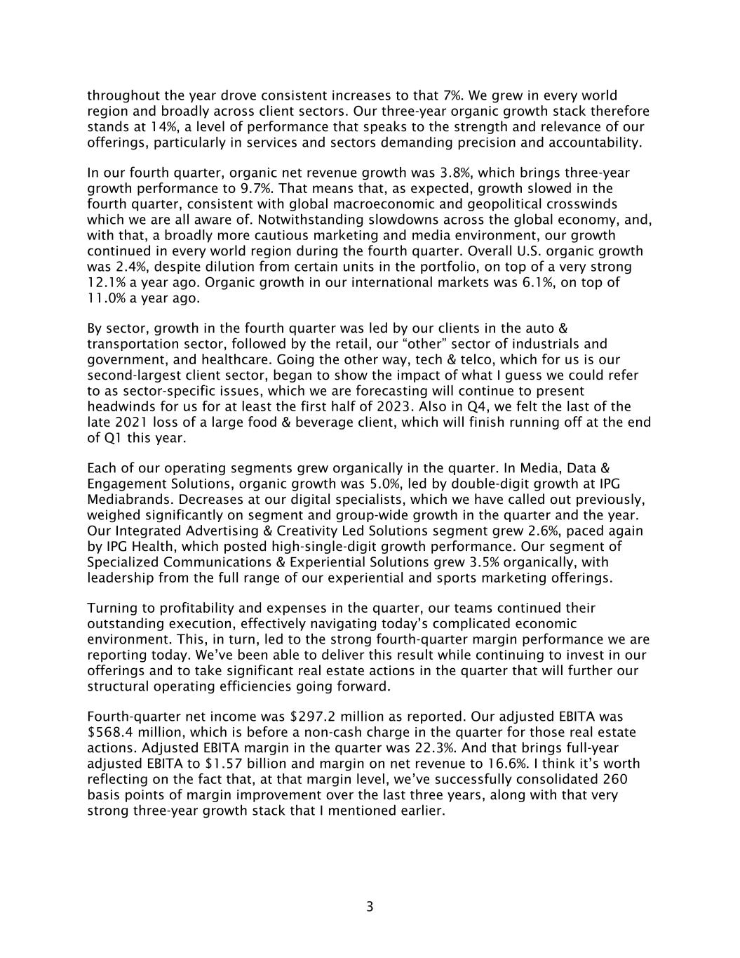3 throughout the year drove consistent increases to that 7%. We grew in every world region and broadly across client sectors. Our three-year organic growth stack therefore stands at 14%, a level of performance that speaks to the strength and relevance of our offerings, particularly in services and sectors demanding precision and accountability. In our fourth quarter, organic net revenue growth was 3.8%, which brings three-year growth performance to 9.7%. That means that, as expected, growth slowed in the fourth quarter, consistent with global macroeconomic and geopolitical crosswinds which we are all aware of. Notwithstanding slowdowns across the global economy, and, with that, a broadly more cautious marketing and media environment, our growth continued in every world region during the fourth quarter. Overall U.S. organic growth was 2.4%, despite dilution from certain units in the portfolio, on top of a very strong 12.1% a year ago. Organic growth in our international markets was 6.1%, on top of 11.0% a year ago. By sector, growth in the fourth quarter was led by our clients in the auto & transportation sector, followed by the retail, our “other” sector of industrials and government, and healthcare. Going the other way, tech & telco, which for us is our second-largest client sector, began to show the impact of what I guess we could refer to as sector-specific issues, which we are forecasting will continue to present headwinds for us for at least the first half of 2023. Also in Q4, we felt the last of the late 2021 loss of a large food & beverage client, which will finish running off at the end of Q1 this year. Each of our operating segments grew organically in the quarter. In Media, Data & Engagement Solutions, organic growth was 5.0%, led by double-digit growth at IPG Mediabrands. Decreases at our digital specialists, which we have called out previously, weighed significantly on segment and group-wide growth in the quarter and the year. Our Integrated Advertising & Creativity Led Solutions segment grew 2.6%, paced again by IPG Health, which posted high-single-digit growth performance. Our segment of Specialized Communications & Experiential Solutions grew 3.5% organically, with leadership from the full range of our experiential and sports marketing offerings. Turning to profitability and expenses in the quarter, our teams continued their outstanding execution, effectively navigating today’s complicated economic environment. This, in turn, led to the strong fourth-quarter margin performance we are reporting today. We’ve been able to deliver this result while continuing to invest in our offerings and to take significant real estate actions in the quarter that will further our structural operating efficiencies going forward. Fourth-quarter net income was $297.2 million as reported. Our adjusted EBITA was $568.4 million, which is before a non-cash charge in the quarter for those real estate actions. Adjusted EBITA margin in the quarter was 22.3%. And that brings full-year adjusted EBITA to $1.57 billion and margin on net revenue to 16.6%. I think it’s worth reflecting on the fact that, at that margin level, we’ve successfully consolidated 260 basis points of margin improvement over the last three years, along with that very strong three-year growth stack that I mentioned earlier.
