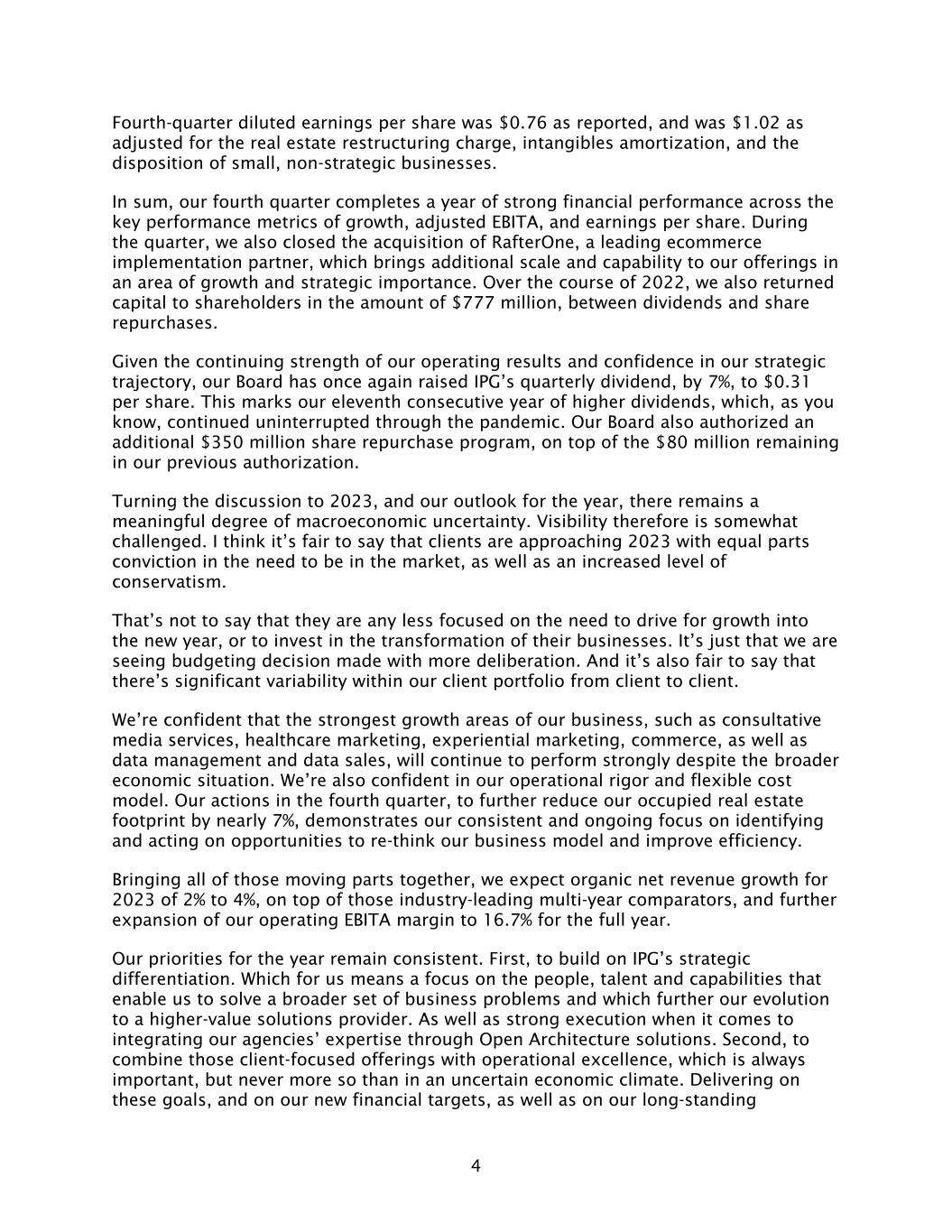 4 Fourth-quarter diluted earnings per share was $0.76 as reported, and was $1.02 as adjusted for the real estate restructuring charge, intangibles amortization, and the disposition of small, non-strategic businesses. In sum, our fourth quarter completes a year of strong financial performance across the key performance metrics of growth, adjusted EBITA, and earnings per share. During the quarter, we also closed the acquisition of RafterOne, a leading ecommerce implementation partner, which brings additional scale and capability to our offerings in an area of growth and strategic importance. Over the course of 2022, we also returned capital to shareholders in the amount of $777 million, between dividends and share repurchases. Given the continuing strength of our operating results and confidence in our strategic trajectory, our Board has once again raised IPG’s quarterly dividend, by 7%, to $0.31 per share. This marks our eleventh consecutive year of higher dividends, which, as you know, continued uninterrupted through the pandemic. Our Board also authorized an additional $350 million share repurchase program, on top of the $80 million remaining in our previous authorization. Turning the discussion to 2023, and our outlook for the year, there remains a meaningful degree of macroeconomic uncertainty. Visibility therefore is somewhat challenged. I think it’s fair to say that clients are approaching 2023 with equal parts conviction in the need to be in the market, as well as an increased level of conservatism. That’s not to say that they are any less focused on the need to drive for growth into the new year, or to invest in the transformation of their businesses. It’s just that we are seeing budgeting decision made with more deliberation. And it’s also fair to say that there’s significant variability within our client portfolio from client to client. We’re confident that the strongest growth areas of our business, such as consultative media services, healthcare marketing, experiential marketing, commerce, as well as data management and data sales, will continue to perform strongly despite the broader economic situation. We’re also confident in our operational rigor and flexible cost model. Our actions in the fourth quarter, to further reduce our occupied real estate footprint by nearly 7%, demonstrates our consistent and ongoing focus on identifying and acting on opportunities to re-think our business model and improve efficiency. Bringing all of those moving parts together, we expect organic net revenue growth for 2023 of 2% to 4%, on top of those industry-leading multi-year comparators, and further expansion of our operating EBITA margin to 16.7% for the full year. Our priorities for the year remain consistent. First, to build on IPG’s strategic differentiation. Which for us means a focus on the people, talent and capabilities that enable us to solve a broader set of business problems and which further our evolution to a higher-value solutions provider. As well as strong execution when it comes to integrating our agencies’ expertise through Open Architecture solutions. Second, to combine those client-focused offerings with operational excellence, which is always important, but never more so than in an uncertain economic climate. Delivering on these goals, and on our new financial targets, as well as on our long-standing