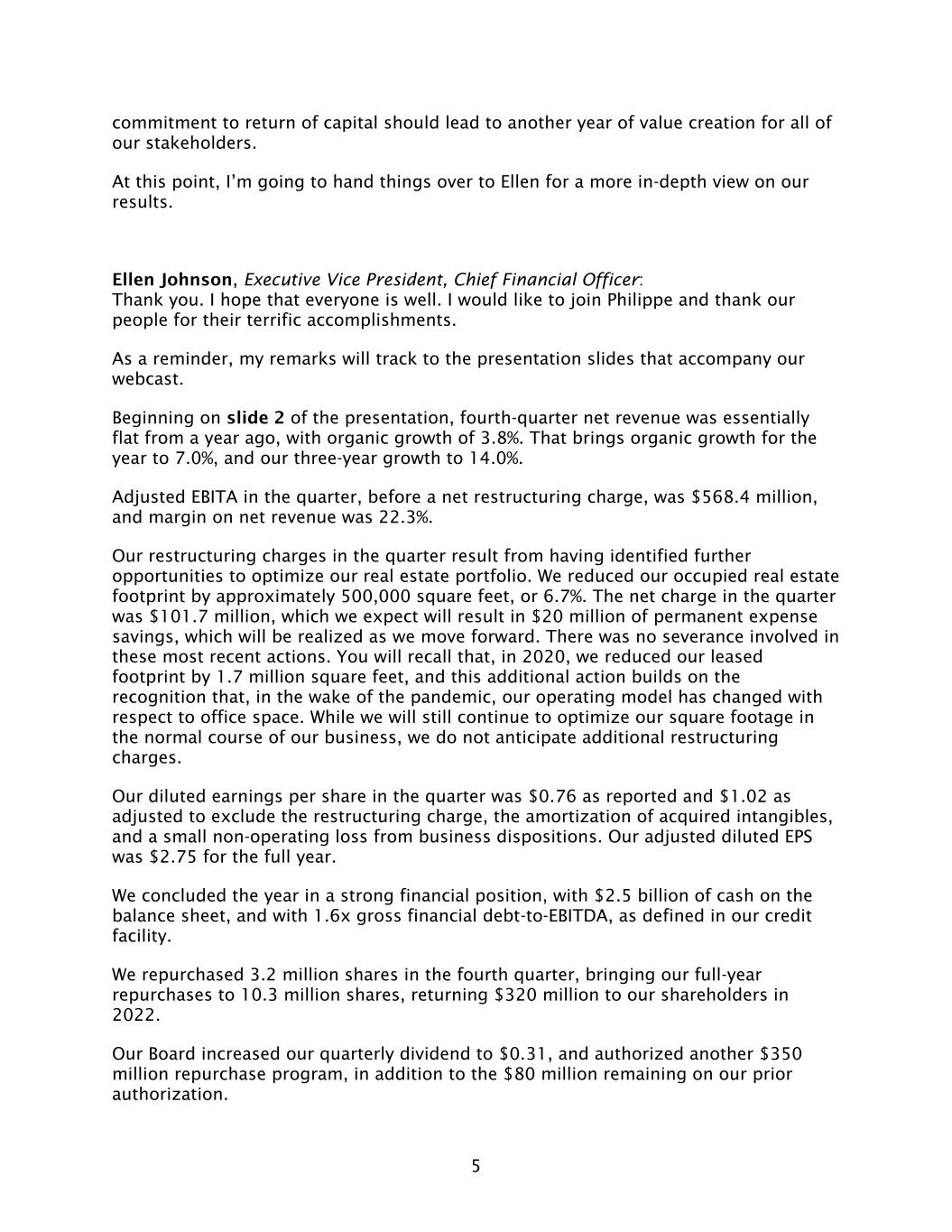 5 commitment to return of capital should lead to another year of value creation for all of our stakeholders. At this point, I’m going to hand things over to Ellen for a more in-depth view on our results. Ellen Johnson, Executive Vice President, Chief Financial Officer: Thank you. I hope that everyone is well. I would like to join Philippe and thank our people for their terrific accomplishments. As a reminder, my remarks will track to the presentation slides that accompany our webcast. Beginning on slide 2 of the presentation, fourth-quarter net revenue was essentially flat from a year ago, with organic growth of 3.8%. That brings organic growth for the year to 7.0%, and our three-year growth to 14.0%. Adjusted EBITA in the quarter, before a net restructuring charge, was $568.4 million, and margin on net revenue was 22.3%. Our restructuring charges in the quarter result from having identified further opportunities to optimize our real estate portfolio. We reduced our occupied real estate footprint by approximately 500,000 square feet, or 6.7%. The net charge in the quarter was $101.7 million, which we expect will result in $20 million of permanent expense savings, which will be realized as we move forward. There was no severance involved in these most recent actions. You will recall that, in 2020, we reduced our leased footprint by 1.7 million square feet, and this additional action builds on the recognition that, in the wake of the pandemic, our operating model has changed with respect to office space. While we will still continue to optimize our square footage in the normal course of our business, we do not anticipate additional restructuring charges. Our diluted earnings per share in the quarter was $0.76 as reported and $1.02 as adjusted to exclude the restructuring charge, the amortization of acquired intangibles, and a small non-operating loss from business dispositions. Our adjusted diluted EPS was $2.75 for the full year. We concluded the year in a strong financial position, with $2.5 billion of cash on the balance sheet, and with 1.6x gross financial debt-to-EBITDA, as defined in our credit facility. We repurchased 3.2 million shares in the fourth quarter, bringing our full-year repurchases to 10.3 million shares, returning $320 million to our shareholders in 2022. Our Board increased our quarterly dividend to $0.31, and authorized another $350 million repurchase program, in addition to the $80 million remaining on our prior authorization.