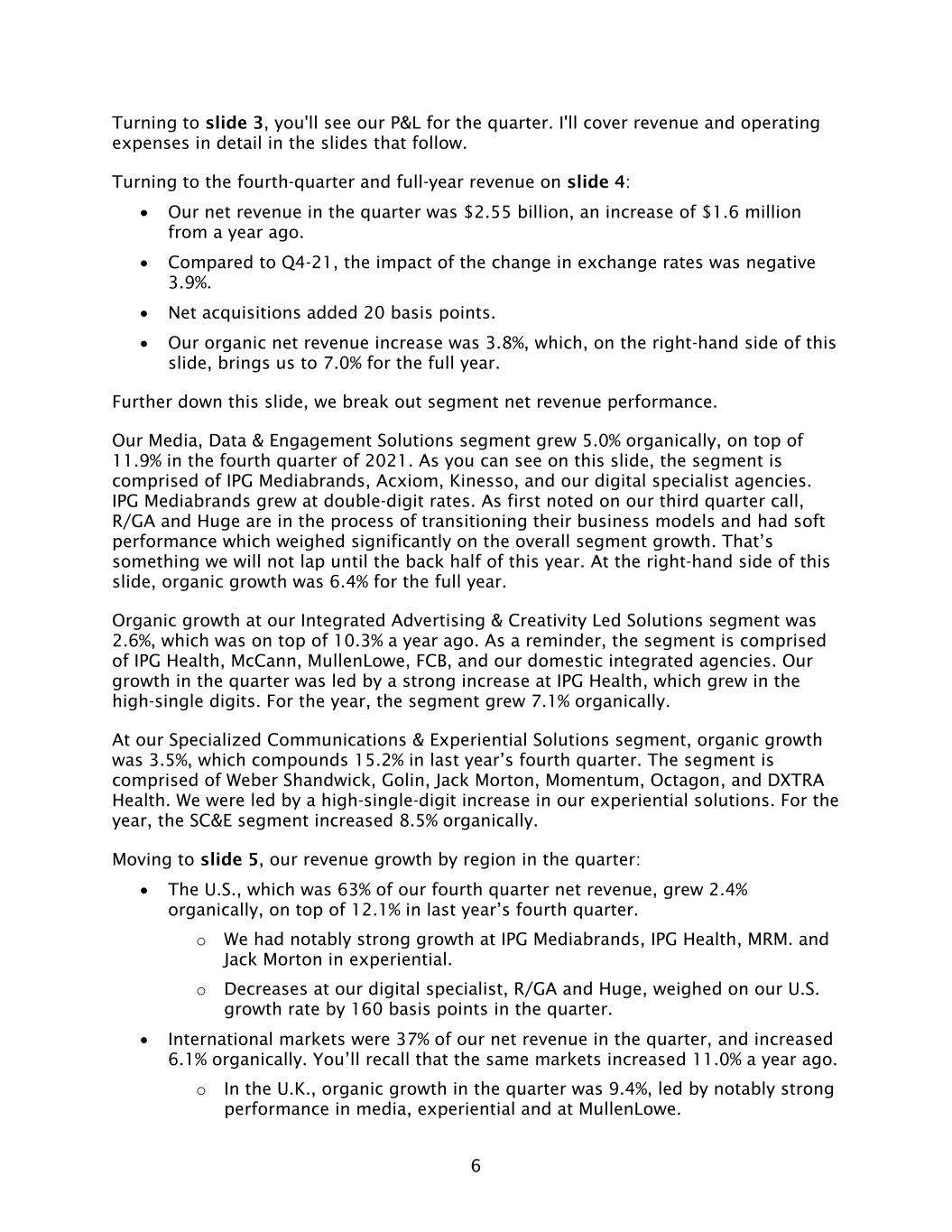 6 Turning to slide 3, you'll see our P&L for the quarter. I'll cover revenue and operating expenses in detail in the slides that follow. Turning to the fourth-quarter and full-year revenue on slide 4: • Our net revenue in the quarter was $2.55 billion, an increase of $1.6 million from a year ago. • Compared to Q4-21, the impact of the change in exchange rates was negative 3.9%. • Net acquisitions added 20 basis points. • Our organic net revenue increase was 3.8%, which, on the right-hand side of this slide, brings us to 7.0% for the full year. Further down this slide, we break out segment net revenue performance. Our Media, Data & Engagement Solutions segment grew 5.0% organically, on top of 11.9% in the fourth quarter of 2021. As you can see on this slide, the segment is comprised of IPG Mediabrands, Acxiom, Kinesso, and our digital specialist agencies. IPG Mediabrands grew at double-digit rates. As first noted on our third quarter call, R/GA and Huge are in the process of transitioning their business models and had soft performance which weighed significantly on the overall segment growth. That’s something we will not lap until the back half of this year. At the right-hand side of this slide, organic growth was 6.4% for the full year. Organic growth at our Integrated Advertising & Creativity Led Solutions segment was 2.6%, which was on top of 10.3% a year ago. As a reminder, the segment is comprised of IPG Health, McCann, MullenLowe, FCB, and our domestic integrated agencies. Our growth in the quarter was led by a strong increase at IPG Health, which grew in the high-single digits. For the year, the segment grew 7.1% organically. At our Specialized Communications & Experiential Solutions segment, organic growth was 3.5%, which compounds 15.2% in last year’s fourth quarter. The segment is comprised of Weber Shandwick, Golin, Jack Morton, Momentum, Octagon, and DXTRA Health. We were led by a high-single-digit increase in our experiential solutions. For the year, the SC&E segment increased 8.5% organically. Moving to slide 5, our revenue growth by region in the quarter: • The U.S., which was 63% of our fourth quarter net revenue, grew 2.4% organically, on top of 12.1% in last year’s fourth quarter. o We had notably strong growth at IPG Mediabrands, IPG Health, MRM. and Jack Morton in experiential. o Decreases at our digital specialist, R/GA and Huge, weighed on our U.S. growth rate by 160 basis points in the quarter. • International markets were 37% of our net revenue in the quarter, and increased 6.1% organically. You’ll recall that the same markets increased 11.0% a year ago. o In the U.K., organic growth in the quarter was 9.4%, led by notably strong performance in media, experiential and at MullenLowe.