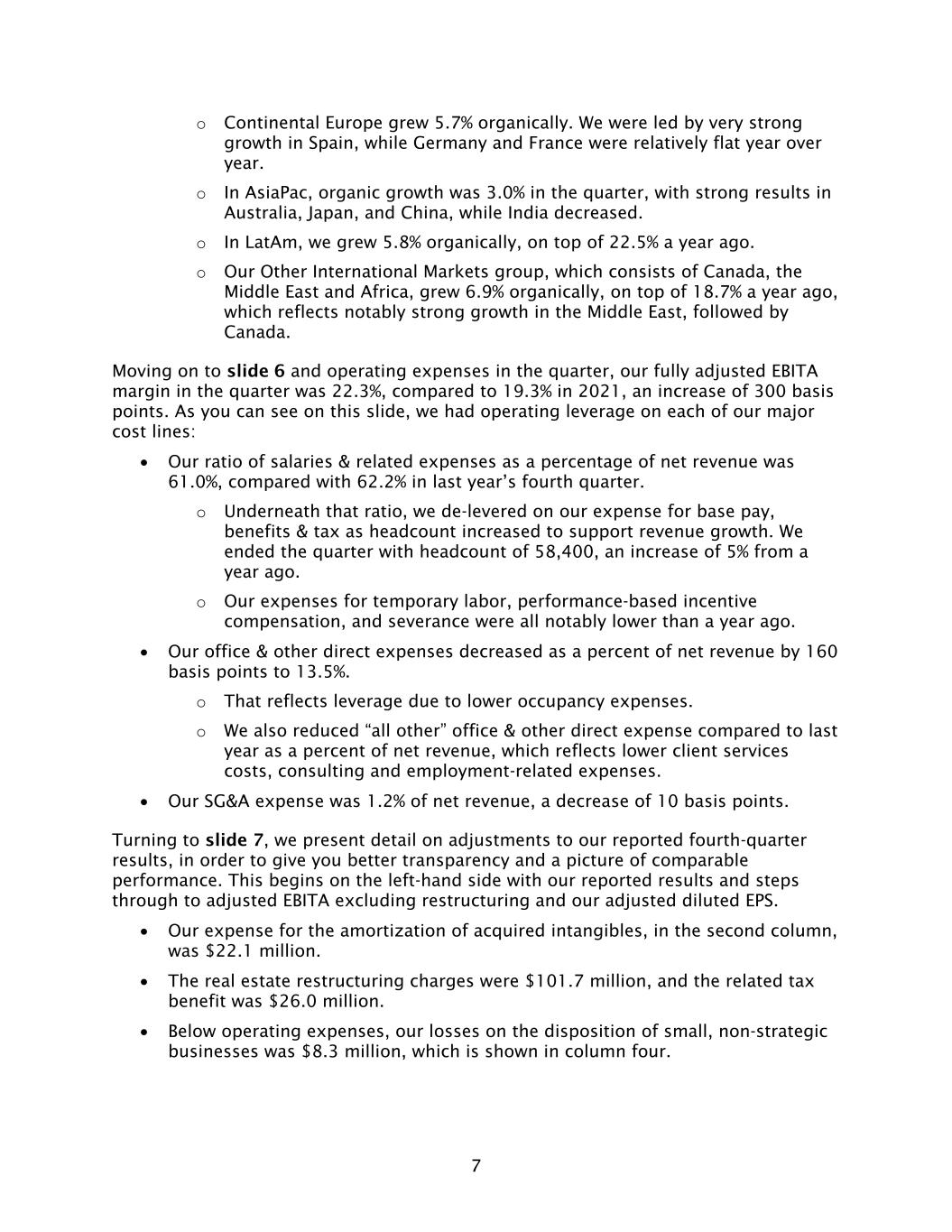 7 o Continental Europe grew 5.7% organically. We were led by very strong growth in Spain, while Germany and France were relatively flat year over year. o In AsiaPac, organic growth was 3.0% in the quarter, with strong results in Australia, Japan, and China, while India decreased. o In LatAm, we grew 5.8% organically, on top of 22.5% a year ago. o Our Other International Markets group, which consists of Canada, the Middle East and Africa, grew 6.9% organically, on top of 18.7% a year ago, which reflects notably strong growth in the Middle East, followed by Canada. Moving on to slide 6 and operating expenses in the quarter, our fully adjusted EBITA margin in the quarter was 22.3%, compared to 19.3% in 2021, an increase of 300 basis points. As you can see on this slide, we had operating leverage on each of our major cost lines: • Our ratio of salaries & related expenses as a percentage of net revenue was 61.0%, compared with 62.2% in last year’s fourth quarter. o Underneath that ratio, we de-levered on our expense for base pay, benefits & tax as headcount increased to support revenue growth. We ended the quarter with headcount of 58,400, an increase of 5% from a year ago. o Our expenses for temporary labor, performance-based incentive compensation, and severance were all notably lower than a year ago. • Our office & other direct expenses decreased as a percent of net revenue by 160 basis points to 13.5%. o That reflects leverage due to lower occupancy expenses. o We also reduced “all other” office & other direct expense compared to last year as a percent of net revenue, which reflects lower client services costs, consulting and employment-related expenses. • Our SG&A expense was 1.2% of net revenue, a decrease of 10 basis points. Turning to slide 7, we present detail on adjustments to our reported fourth-quarter results, in order to give you better transparency and a picture of comparable performance. This begins on the left-hand side with our reported results and steps through to adjusted EBITA excluding restructuring and our adjusted diluted EPS. • Our expense for the amortization of acquired intangibles, in the second column, was $22.1 million. • The real estate restructuring charges were $101.7 million, and the related tax benefit was $26.0 million. • Below operating expenses, our losses on the disposition of small, non-strategic businesses was $8.3 million, which is shown in column four.