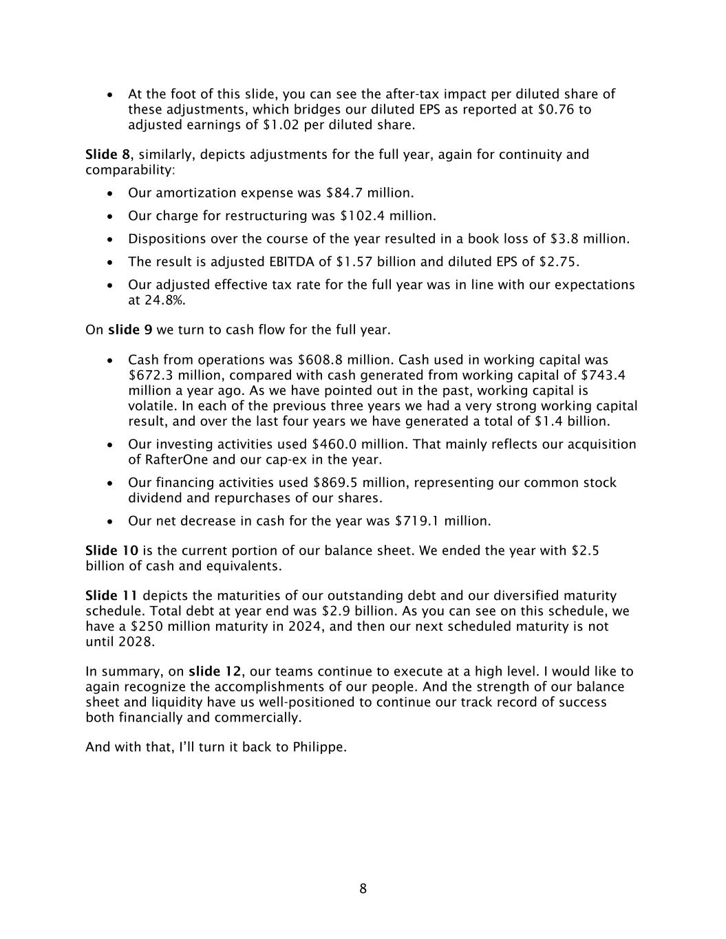 8 • At the foot of this slide, you can see the after-tax impact per diluted share of these adjustments, which bridges our diluted EPS as reported at $0.76 to adjusted earnings of $1.02 per diluted share. Slide 8, similarly, depicts adjustments for the full year, again for continuity and comparability: • Our amortization expense was $84.7 million. • Our charge for restructuring was $102.4 million. • Dispositions over the course of the year resulted in a book loss of $3.8 million. • The result is adjusted EBITDA of $1.57 billion and diluted EPS of $2.75. • Our adjusted effective tax rate for the full year was in line with our expectations at 24.8%. On slide 9 we turn to cash flow for the full year. • Cash from operations was $608.8 million. Cash used in working capital was $672.3 million, compared with cash generated from working capital of $743.4 million a year ago. As we have pointed out in the past, working capital is volatile. In each of the previous three years we had a very strong working capital result, and over the last four years we have generated a total of $1.4 billion. • Our investing activities used $460.0 million. That mainly reflects our acquisition of RafterOne and our cap-ex in the year. • Our financing activities used $869.5 million, representing our common stock dividend and repurchases of our shares. • Our net decrease in cash for the year was $719.1 million. Slide 10 is the current portion of our balance sheet. We ended the year with $2.5 billion of cash and equivalents. Slide 11 depicts the maturities of our outstanding debt and our diversified maturity schedule. Total debt at year end was $2.9 billion. As you can see on this schedule, we have a $250 million maturity in 2024, and then our next scheduled maturity is not until 2028. In summary, on slide 12, our teams continue to execute at a high level. I would like to again recognize the accomplishments of our people. And the strength of our balance sheet and liquidity have us well-positioned to continue our track record of success both financially and commercially. And with that, I’ll turn it back to Philippe.