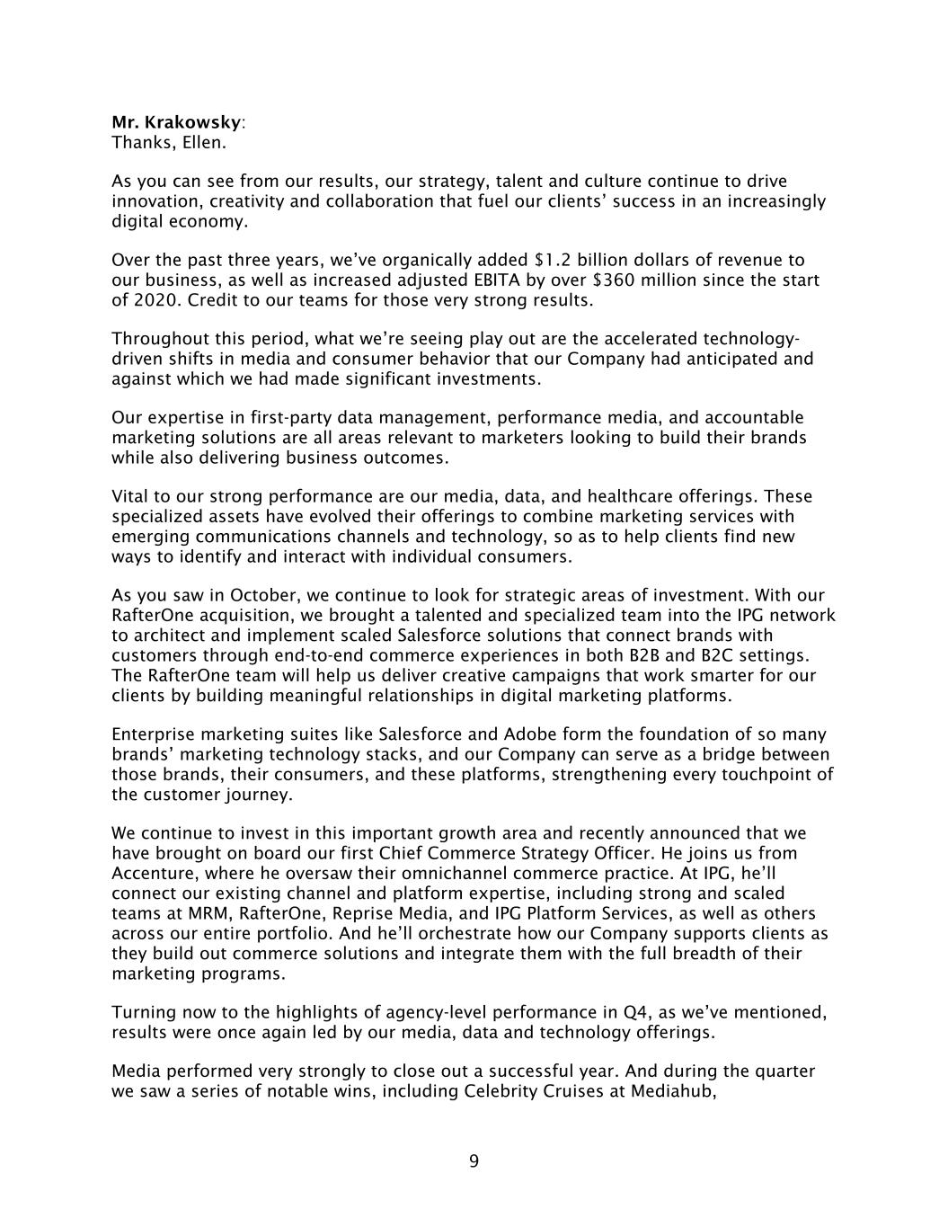9 Mr. Krakowsky: Thanks, Ellen. As you can see from our results, our strategy, talent and culture continue to drive innovation, creativity and collaboration that fuel our clients’ success in an increasingly digital economy. Over the past three years, we’ve organically added $1.2 billion dollars of revenue to our business, as well as increased adjusted EBITA by over $360 million since the start of 2020. Credit to our teams for those very strong results. Throughout this period, what we’re seeing play out are the accelerated technology- driven shifts in media and consumer behavior that our Company had anticipated and against which we had made significant investments. Our expertise in first-party data management, performance media, and accountable marketing solutions are all areas relevant to marketers looking to build their brands while also delivering business outcomes. Vital to our strong performance are our media, data, and healthcare offerings. These specialized assets have evolved their offerings to combine marketing services with emerging communications channels and technology, so as to help clients find new ways to identify and interact with individual consumers. As you saw in October, we continue to look for strategic areas of investment. With our RafterOne acquisition, we brought a talented and specialized team into the IPG network to architect and implement scaled Salesforce solutions that connect brands with customers through end-to-end commerce experiences in both B2B and B2C settings. The RafterOne team will help us deliver creative campaigns that work smarter for our clients by building meaningful relationships in digital marketing platforms. Enterprise marketing suites like Salesforce and Adobe form the foundation of so many brands’ marketing technology stacks, and our Company can serve as a bridge between those brands, their consumers, and these platforms, strengthening every touchpoint of the customer journey. We continue to invest in this important growth area and recently announced that we have brought on board our first Chief Commerce Strategy Officer. He joins us from Accenture, where he oversaw their omnichannel commerce practice. At IPG, he’ll connect our existing channel and platform expertise, including strong and scaled teams at MRM, RafterOne, Reprise Media, and IPG Platform Services, as well as others across our entire portfolio. And he’ll orchestrate how our Company supports clients as they build out commerce solutions and integrate them with the full breadth of their marketing programs. Turning now to the highlights of agency-level performance in Q4, as we’ve mentioned, results were once again led by our media, data and technology offerings. Media performed very strongly to close out a successful year. And during the quarter we saw a series of notable wins, including Celebrity Cruises at Mediahub,