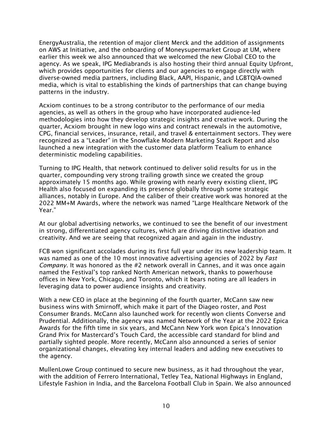 10 EnergyAustralia, the retention of major client Merck and the addition of assignments on AWS at Initiative, and the onboarding of Moneysupermarket Group at UM, where earlier this week we also announced that we welcomed the new Global CEO to the agency. As we speak, IPG Mediabrands is also hosting their third annual Equity Upfront, which provides opportunities for clients and our agencies to engage directly with diverse-owned media partners, including Black, AAPI, Hispanic, and LGBTQIA-owned media, which is vital to establishing the kinds of partnerships that can change buying patterns in the industry. Acxiom continues to be a strong contributor to the performance of our media agencies, as well as others in the group who have incorporated audience-led methodologies into how they develop strategic insights and creative work. During the quarter, Acxiom brought in new logo wins and contract renewals in the automotive, CPG, financial services, insurance, retail, and travel & entertainment sectors. They were recognized as a “Leader” in the Snowflake Modern Marketing Stack Report and also launched a new integration with the customer data platform Tealium to enhance deterministic modeling capabilities. Turning to IPG Health, that network continued to deliver solid results for us in the quarter, compounding very strong trailing growth since we created the group approximately 15 months ago. While growing with nearly every existing client, IPG Health also focused on expanding its presence globally through some strategic alliances, notably in Europe. And the caliber of their creative work was honored at the 2022 MM+M Awards, where the network was named “Large Healthcare Network of the Year.” At our global advertising networks, we continued to see the benefit of our investment in strong, differentiated agency cultures, which are driving distinctive ideation and creativity. And we are seeing that recognized again and again in the industry. FCB won significant accolades during its first full year under its new leadership team. It was named as one of the 10 most innovative advertising agencies of 2022 by Fast Company. It was honored as the #2 network overall in Cannes, and it was once again named the Festival’s top ranked North American network, thanks to powerhouse offices in New York, Chicago, and Toronto, which it bears noting are all leaders in leveraging data to power audience insights and creativity. With a new CEO in place at the beginning of the fourth quarter, McCann saw new business wins with Smirnoff, which make it part of the Diageo roster, and Post Consumer Brands. McCann also launched work for recently won clients Converse and Prudential. Additionally, the agency was named Network of the Year at the 2022 Epica Awards for the fifth time in six years, and McCann New York won Epica’s Innovation Grand Prix for Mastercard’s Touch Card, the accessible card standard for blind and partially sighted people. More recently, McCann also announced a series of senior organizational changes, elevating key internal leaders and adding new executives to the agency. MullenLowe Group continued to secure new business, as it had throughout the year, with the addition of Ferrero International, Tetley Tea, National Highways in England, Lifestyle Fashion in India, and the Barcelona Football Club in Spain. We also announced