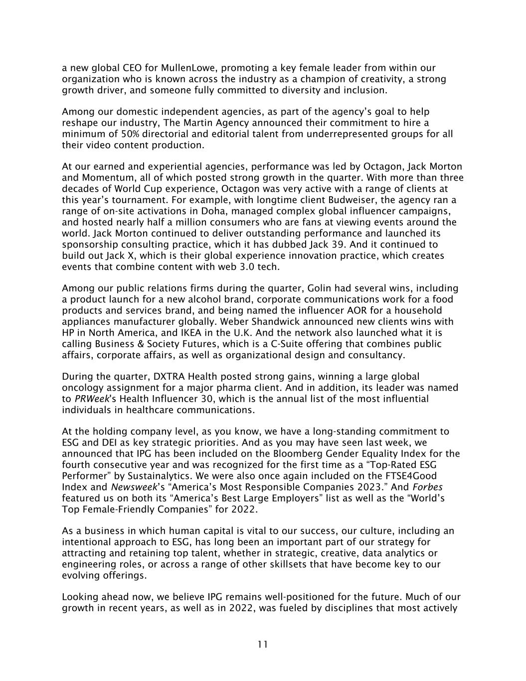 11 a new global CEO for MullenLowe, promoting a key female leader from within our organization who is known across the industry as a champion of creativity, a strong growth driver, and someone fully committed to diversity and inclusion. Among our domestic independent agencies, as part of the agency’s goal to help reshape our industry, The Martin Agency announced their commitment to hire a minimum of 50% directorial and editorial talent from underrepresented groups for all their video content production. At our earned and experiential agencies, performance was led by Octagon, Jack Morton and Momentum, all of which posted strong growth in the quarter. With more than three decades of World Cup experience, Octagon was very active with a range of clients at this year’s tournament. For example, with longtime client Budweiser, the agency ran a range of on-site activations in Doha, managed complex global influencer campaigns, and hosted nearly half a million consumers who are fans at viewing events around the world. Jack Morton continued to deliver outstanding performance and launched its sponsorship consulting practice, which it has dubbed Jack 39. And it continued to build out Jack X, which is their global experience innovation practice, which creates events that combine content with web 3.0 tech. Among our public relations firms during the quarter, Golin had several wins, including a product launch for a new alcohol brand, corporate communications work for a food products and services brand, and being named the influencer AOR for a household appliances manufacturer globally. Weber Shandwick announced new clients wins with HP in North America, and IKEA in the U.K. And the network also launched what it is calling Business & Society Futures, which is a C-Suite offering that combines public affairs, corporate affairs, as well as organizational design and consultancy. During the quarter, DXTRA Health posted strong gains, winning a large global oncology assignment for a major pharma client. And in addition, its leader was named to PRWeek's Health Influencer 30, which is the annual list of the most influential individuals in healthcare communications. At the holding company level, as you know, we have a long-standing commitment to ESG and DEI as key strategic priorities. And as you may have seen last week, we announced that IPG has been included on the Bloomberg Gender Equality Index for the fourth consecutive year and was recognized for the first time as a “Top-Rated ESG Performer” by Sustainalytics. We were also once again included on the FTSE4Good Index and Newsweek’s “America’s Most Responsible Companies 2023.” And Forbes featured us on both its “America’s Best Large Employers” list as well as the “World’s Top Female-Friendly Companies” for 2022. As a business in which human capital is vital to our success, our culture, including an intentional approach to ESG, has long been an important part of our strategy for attracting and retaining top talent, whether in strategic, creative, data analytics or engineering roles, or across a range of other skillsets that have become key to our evolving offerings. Looking ahead now, we believe IPG remains well-positioned for the future. Much of our growth in recent years, as well as in 2022, was fueled by disciplines that most actively