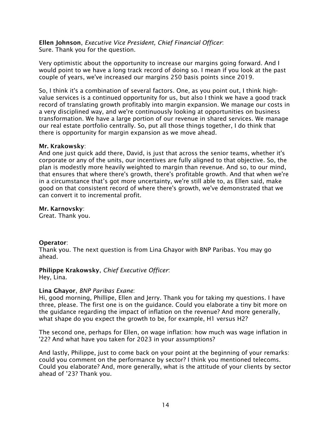 14 Ellen Johnson, Executive Vice President, Chief Financial Officer: Sure. Thank you for the question. Very optimistic about the opportunity to increase our margins going forward. And I would point to we have a long track record of doing so. I mean if you look at the past couple of years, we've increased our margins 250 basis points since 2019. So, I think it's a combination of several factors. One, as you point out, I think high- value services is a continued opportunity for us, but also I think we have a good track record of translating growth profitably into margin expansion. We manage our costs in a very disciplined way, and we're continuously looking at opportunities on business transformation. We have a large portion of our revenue in shared services. We manage our real estate portfolio centrally. So, put all those things together, I do think that there is opportunity for margin expansion as we move ahead. Mr. Krakowsky: And one just quick add there, David, is just that across the senior teams, whether it's corporate or any of the units, our incentives are fully aligned to that objective. So, the plan is modestly more heavily weighted to margin than revenue. And so, to our mind, that ensures that where there's growth, there's profitable growth. And that when we're in a circumstance that’s got more uncertainty, we're still able to, as Ellen said, make good on that consistent record of where there's growth, we've demonstrated that we can convert it to incremental profit. Mr. Karnovsky: Great. Thank you. Operator: Thank you. The next question is from Lina Ghayor with BNP Paribas. You may go ahead. Philippe Krakowsky, Chief Executive Officer: Hey, Lina. Lina Ghayor, BNP Paribas Exane: Hi, good morning, Phillipe, Ellen and Jerry. Thank you for taking my questions. I have three, please. The first one is on the guidance. Could you elaborate a tiny bit more on the guidance regarding the impact of inflation on the revenue? And more generally, what shape do you expect the growth to be, for example, H1 versus H2? The second one, perhaps for Ellen, on wage inflation: how much was wage inflation in '22? And what have you taken for 2023 in your assumptions? And lastly, Philippe, just to come back on your point at the beginning of your remarks: could you comment on the performance by sector? I think you mentioned telecoms. Could you elaborate? And, more generally, what is the attitude of your clients by sector ahead of ’23? Thank you.