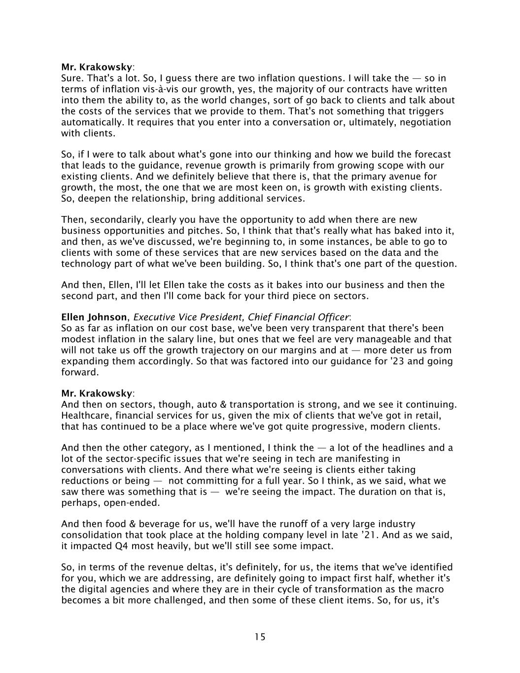 15 Mr. Krakowsky: Sure. That's a lot. So, I guess there are two inflation questions. I will take the — so in terms of inflation vis-à-vis our growth, yes, the majority of our contracts have written into them the ability to, as the world changes, sort of go back to clients and talk about the costs of the services that we provide to them. That's not something that triggers automatically. It requires that you enter into a conversation or, ultimately, negotiation with clients. So, if I were to talk about what's gone into our thinking and how we build the forecast that leads to the guidance, revenue growth is primarily from growing scope with our existing clients. And we definitely believe that there is, that the primary avenue for growth, the most, the one that we are most keen on, is growth with existing clients. So, deepen the relationship, bring additional services. Then, secondarily, clearly you have the opportunity to add when there are new business opportunities and pitches. So, I think that that's really what has baked into it, and then, as we've discussed, we're beginning to, in some instances, be able to go to clients with some of these services that are new services based on the data and the technology part of what we've been building. So, I think that's one part of the question. And then, Ellen, I'll let Ellen take the costs as it bakes into our business and then the second part, and then I'll come back for your third piece on sectors. Ellen Johnson, Executive Vice President, Chief Financial Officer: So as far as inflation on our cost base, we've been very transparent that there's been modest inflation in the salary line, but ones that we feel are very manageable and that will not take us off the growth trajectory on our margins and at — more deter us from expanding them accordingly. So that was factored into our guidance for '23 and going forward. Mr. Krakowsky: And then on sectors, though, auto & transportation is strong, and we see it continuing. Healthcare, financial services for us, given the mix of clients that we've got in retail, that has continued to be a place where we've got quite progressive, modern clients. And then the other category, as I mentioned, I think the — a lot of the headlines and a lot of the sector-specific issues that we're seeing in tech are manifesting in conversations with clients. And there what we're seeing is clients either taking reductions or being — not committing for a full year. So I think, as we said, what we saw there was something that is — we're seeing the impact. The duration on that is, perhaps, open-ended. And then food & beverage for us, we'll have the runoff of a very large industry consolidation that took place at the holding company level in late ’21. And as we said, it impacted Q4 most heavily, but we'll still see some impact. So, in terms of the revenue deltas, it's definitely, for us, the items that we've identified for you, which we are addressing, are definitely going to impact first half, whether it's the digital agencies and where they are in their cycle of transformation as the macro becomes a bit more challenged, and then some of these client items. So, for us, it's