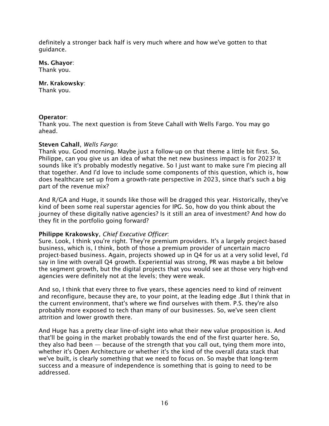 16 definitely a stronger back half is very much where and how we've gotten to that guidance. Ms. Ghayor: Thank you. Mr. Krakowsky: Thank you. Operator: Thank you. The next question is from Steve Cahall with Wells Fargo. You may go ahead. Steven Cahall, Wells Fargo: Thank you. Good morning. Maybe just a follow-up on that theme a little bit first. So, Philippe, can you give us an idea of what the net new business impact is for 2023? It sounds like it's probably modestly negative. So I just want to make sure I'm piecing all that together. And I'd love to include some components of this question, which is, how does healthcare set up from a growth-rate perspective in 2023, since that's such a big part of the revenue mix? And R/GA and Huge, it sounds like those will be dragged this year. Historically, they've kind of been some real superstar agencies for IPG. So, how do you think about the journey of these digitally native agencies? Is it still an area of investment? And how do they fit in the portfolio going forward? Philippe Krakowsky, Chief Executive Officer: Sure. Look, I think you're right. They're premium providers. It's a largely project-based business, which is, I think, both of those a premium provider of uncertain macro project-based business. Again, projects showed up in Q4 for us at a very solid level, I'd say in line with overall Q4 growth. Experiential was strong, PR was maybe a bit below the segment growth, but the digital projects that you would see at those very high-end agencies were definitely not at the levels; they were weak. And so, I think that every three to five years, these agencies need to kind of reinvent and reconfigure, because they are, to your point, at the leading edge .But I think that in the current environment, that's where we find ourselves with them. P.S. they're also probably more exposed to tech than many of our businesses. So, we've seen client attrition and lower growth there. And Huge has a pretty clear line-of-sight into what their new value proposition is. And that'll be going in the market probably towards the end of the first quarter here. So, they also had been — because of the strength that you call out, tying them more into, whether it's Open Architecture or whether it's the kind of the overall data stack that we've built, is clearly something that we need to focus on. So maybe that long-term success and a measure of independence is something that is going to need to be addressed.