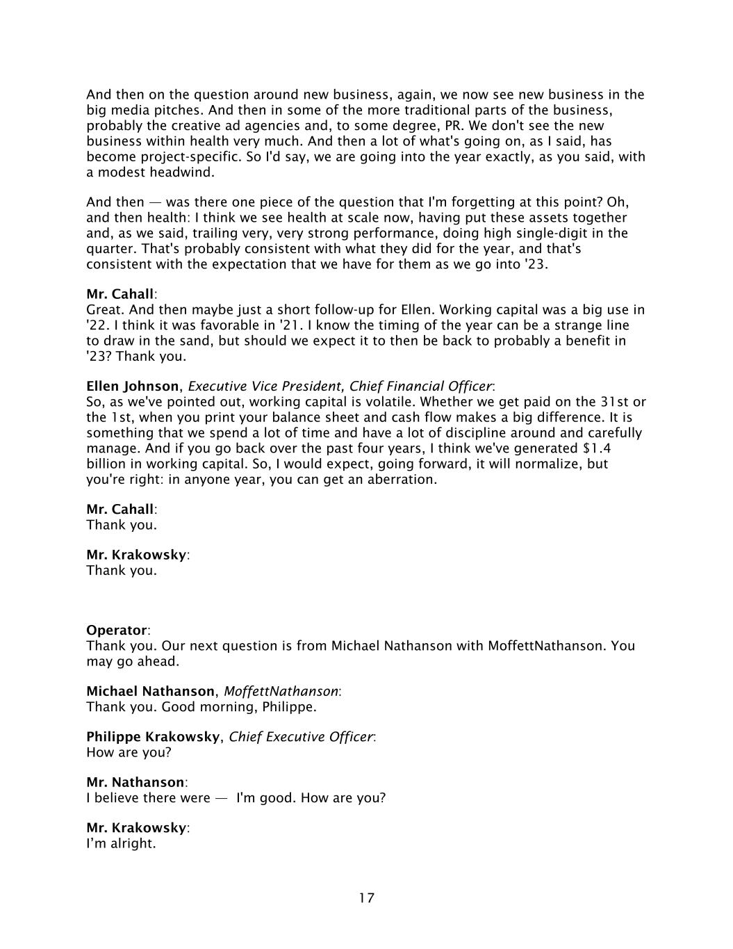 17 And then on the question around new business, again, we now see new business in the big media pitches. And then in some of the more traditional parts of the business, probably the creative ad agencies and, to some degree, PR. We don't see the new business within health very much. And then a lot of what's going on, as I said, has become project-specific. So I'd say, we are going into the year exactly, as you said, with a modest headwind. And then — was there one piece of the question that I'm forgetting at this point? Oh, and then health: I think we see health at scale now, having put these assets together and, as we said, trailing very, very strong performance, doing high single-digit in the quarter. That's probably consistent with what they did for the year, and that's consistent with the expectation that we have for them as we go into '23. Mr. Cahall: Great. And then maybe just a short follow-up for Ellen. Working capital was a big use in '22. I think it was favorable in '21. I know the timing of the year can be a strange line to draw in the sand, but should we expect it to then be back to probably a benefit in '23? Thank you. Ellen Johnson, Executive Vice President, Chief Financial Officer: So, as we've pointed out, working capital is volatile. Whether we get paid on the 31st or the 1st, when you print your balance sheet and cash flow makes a big difference. It is something that we spend a lot of time and have a lot of discipline around and carefully manage. And if you go back over the past four years, I think we've generated $1.4 billion in working capital. So, I would expect, going forward, it will normalize, but you're right: in anyone year, you can get an aberration. Mr. Cahall: Thank you. Mr. Krakowsky: Thank you. Operator: Thank you. Our next question is from Michael Nathanson with MoffettNathanson. You may go ahead. Michael Nathanson, MoffettNathanson: Thank you. Good morning, Philippe. Philippe Krakowsky, Chief Executive Officer: How are you? Mr. Nathanson: I believe there were — I'm good. How are you? Mr. Krakowsky: I’m alright.