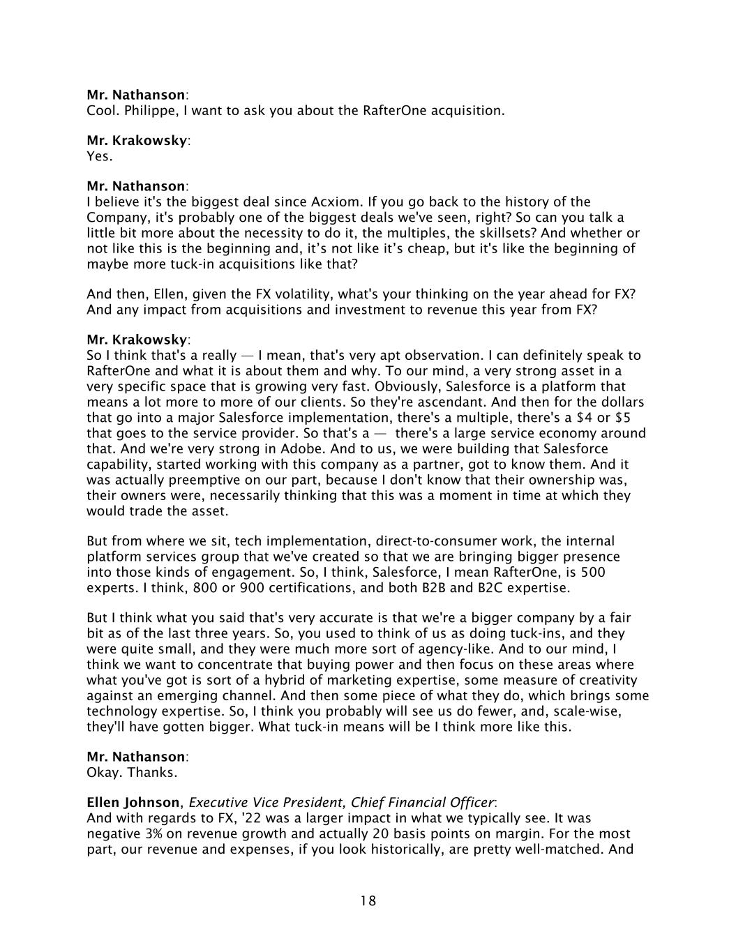 18 Mr. Nathanson: Cool. Philippe, I want to ask you about the RafterOne acquisition. Mr. Krakowsky: Yes. Mr. Nathanson: I believe it's the biggest deal since Acxiom. If you go back to the history of the Company, it's probably one of the biggest deals we've seen, right? So can you talk a little bit more about the necessity to do it, the multiples, the skillsets? And whether or not like this is the beginning and, it’s not like it’s cheap, but it's like the beginning of maybe more tuck-in acquisitions like that? And then, Ellen, given the FX volatility, what's your thinking on the year ahead for FX? And any impact from acquisitions and investment to revenue this year from FX? Mr. Krakowsky: So I think that's a really — I mean, that's very apt observation. I can definitely speak to RafterOne and what it is about them and why. To our mind, a very strong asset in a very specific space that is growing very fast. Obviously, Salesforce is a platform that means a lot more to more of our clients. So they're ascendant. And then for the dollars that go into a major Salesforce implementation, there's a multiple, there's a $4 or $5 that goes to the service provider. So that's a — there's a large service economy around that. And we're very strong in Adobe. And to us, we were building that Salesforce capability, started working with this company as a partner, got to know them. And it was actually preemptive on our part, because I don't know that their ownership was, their owners were, necessarily thinking that this was a moment in time at which they would trade the asset. But from where we sit, tech implementation, direct-to-consumer work, the internal platform services group that we've created so that we are bringing bigger presence into those kinds of engagement. So, I think, Salesforce, I mean RafterOne, is 500 experts. I think, 800 or 900 certifications, and both B2B and B2C expertise. But I think what you said that's very accurate is that we're a bigger company by a fair bit as of the last three years. So, you used to think of us as doing tuck-ins, and they were quite small, and they were much more sort of agency-like. And to our mind, I think we want to concentrate that buying power and then focus on these areas where what you've got is sort of a hybrid of marketing expertise, some measure of creativity against an emerging channel. And then some piece of what they do, which brings some technology expertise. So, I think you probably will see us do fewer, and, scale-wise, they'll have gotten bigger. What tuck-in means will be I think more like this. Mr. Nathanson: Okay. Thanks. Ellen Johnson, Executive Vice President, Chief Financial Officer: And with regards to FX, '22 was a larger impact in what we typically see. It was negative 3% on revenue growth and actually 20 basis points on margin. For the most part, our revenue and expenses, if you look historically, are pretty well-matched. And
