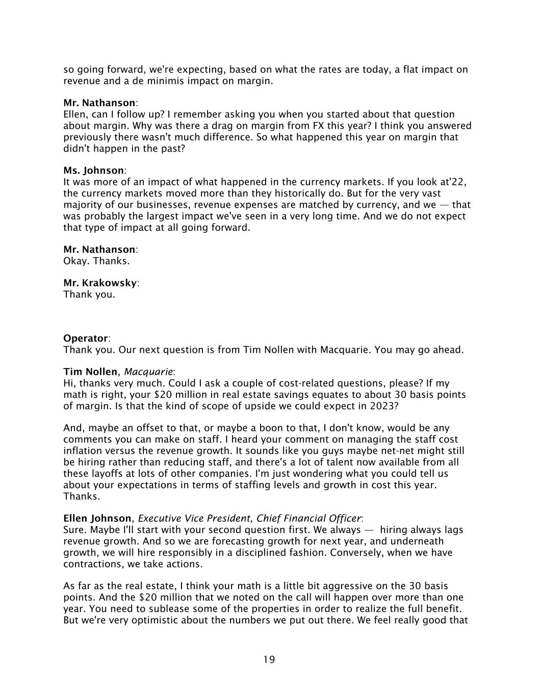 19 so going forward, we're expecting, based on what the rates are today, a flat impact on revenue and a de minimis impact on margin. Mr. Nathanson: Ellen, can I follow up? I remember asking you when you started about that question about margin. Why was there a drag on margin from FX this year? I think you answered previously there wasn't much difference. So what happened this year on margin that didn't happen in the past? Ms. Johnson: It was more of an impact of what happened in the currency markets. If you look at'22, the currency markets moved more than they historically do. But for the very vast majority of our businesses, revenue expenses are matched by currency, and we — that was probably the largest impact we've seen in a very long time. And we do not expect that type of impact at all going forward. Mr. Nathanson: Okay. Thanks. Mr. Krakowsky: Thank you. Operator: Thank you. Our next question is from Tim Nollen with Macquarie. You may go ahead. Tim Nollen, Macquarie: Hi, thanks very much. Could I ask a couple of cost-related questions, please? If my math is right, your $20 million in real estate savings equates to about 30 basis points of margin. Is that the kind of scope of upside we could expect in 2023? And, maybe an offset to that, or maybe a boon to that, I don't know, would be any comments you can make on staff. I heard your comment on managing the staff cost inflation versus the revenue growth. It sounds like you guys maybe net-net might still be hiring rather than reducing staff, and there's a lot of talent now available from all these layoffs at lots of other companies. I'm just wondering what you could tell us about your expectations in terms of staffing levels and growth in cost this year. Thanks. Ellen Johnson, Executive Vice President, Chief Financial Officer: Sure. Maybe I'll start with your second question first. We always — hiring always lags revenue growth. And so we are forecasting growth for next year, and underneath growth, we will hire responsibly in a disciplined fashion. Conversely, when we have contractions, we take actions. As far as the real estate, I think your math is a little bit aggressive on the 30 basis points. And the $20 million that we noted on the call will happen over more than one year. You need to sublease some of the properties in order to realize the full benefit. But we're very optimistic about the numbers we put out there. We feel really good that