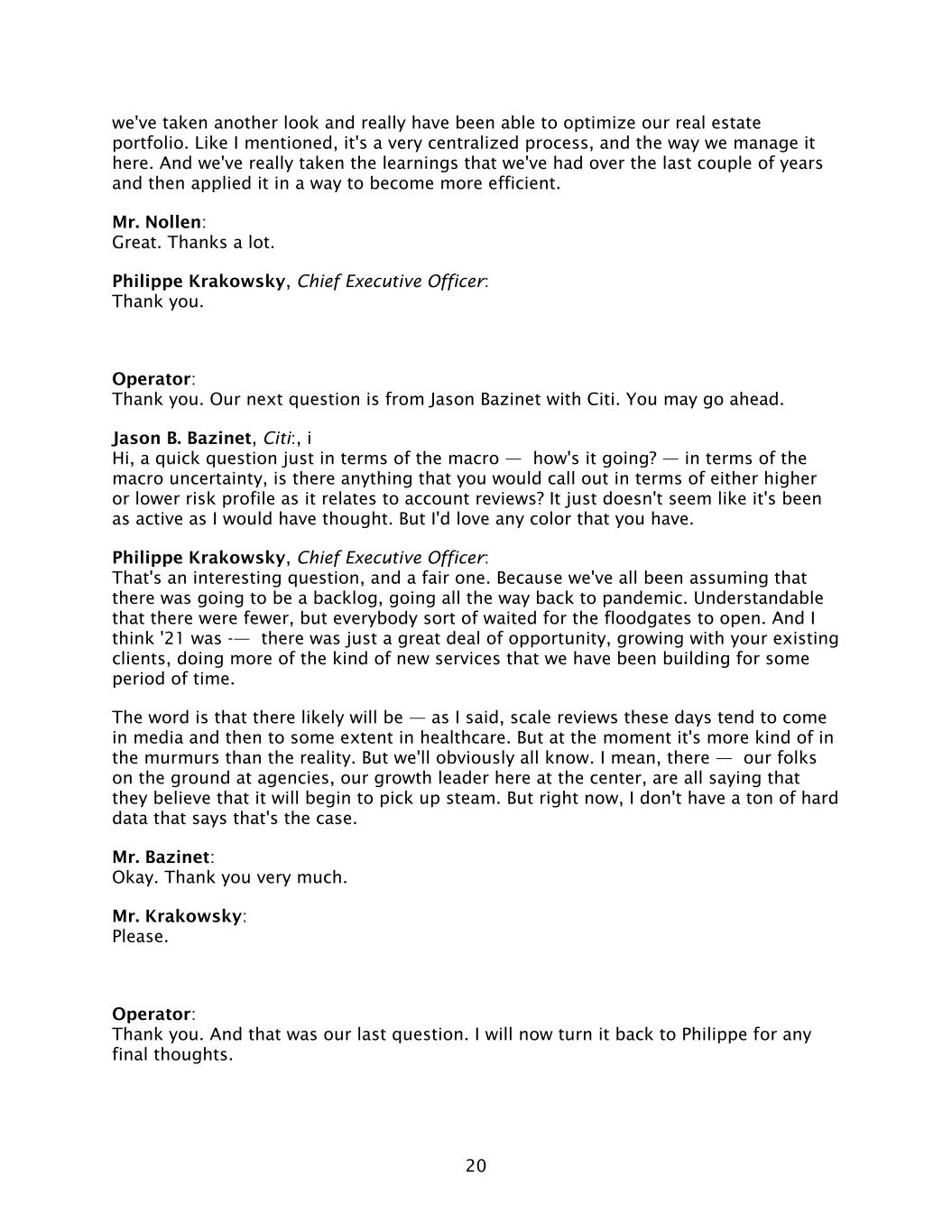 20 we've taken another look and really have been able to optimize our real estate portfolio. Like I mentioned, it's a very centralized process, and the way we manage it here. And we've really taken the learnings that we've had over the last couple of years and then applied it in a way to become more efficient. Mr. Nollen: Great. Thanks a lot. Philippe Krakowsky, Chief Executive Officer: Thank you. Operator: Thank you. Our next question is from Jason Bazinet with Citi. You may go ahead. Jason B. Bazinet, Citi:, i Hi, a quick question just in terms of the macro — how's it going? — in terms of the macro uncertainty, is there anything that you would call out in terms of either higher or lower risk profile as it relates to account reviews? It just doesn't seem like it's been as active as I would have thought. But I'd love any color that you have. Philippe Krakowsky, Chief Executive Officer: That's an interesting question, and a fair one. Because we've all been assuming that there was going to be a backlog, going all the way back to pandemic. Understandable that there were fewer, but everybody sort of waited for the floodgates to open. And I think '21 was -— there was just a great deal of opportunity, growing with your existing clients, doing more of the kind of new services that we have been building for some period of time. The word is that there likely will be — as I said, scale reviews these days tend to come in media and then to some extent in healthcare. But at the moment it's more kind of in the murmurs than the reality. But we'll obviously all know. I mean, there — our folks on the ground at agencies, our growth leader here at the center, are all saying that they believe that it will begin to pick up steam. But right now, I don't have a ton of hard data that says that's the case. Mr. Bazinet: Okay. Thank you very much. Mr. Krakowsky: Please. Operator: Thank you. And that was our last question. I will now turn it back to Philippe for any final thoughts.