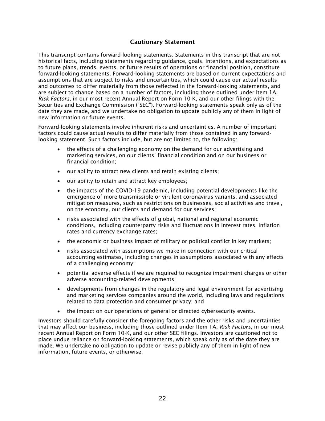 22 Cautionary Statement This transcript contains forward-looking statements. Statements in this transcript that are not historical facts, including statements regarding guidance, goals, intentions, and expectations as to future plans, trends, events, or future results of operations or financial position, constitute forward-looking statements. Forward-looking statements are based on current expectations and assumptions that are subject to risks and uncertainties, which could cause our actual results and outcomes to differ materially from those reflected in the forward-looking statements, and are subject to change based on a number of factors, including those outlined under Item 1A, Risk Factors, in our most recent Annual Report on Form 10-K, and our other filings with the Securities and Exchange Commission ("SEC"). Forward-looking statements speak only as of the date they are made, and we undertake no obligation to update publicly any of them in light of new information or future events. Forward-looking statements involve inherent risks and uncertainties. A number of important factors could cause actual results to differ materially from those contained in any forward- looking statement. Such factors include, but are not limited to, the following: • the effects of a challenging economy on the demand for our advertising and marketing services, on our clients’ financial condition and on our business or financial condition; • our ability to attract new clients and retain existing clients; • our ability to retain and attract key employees; • the impacts of the COVID-19 pandemic, including potential developments like the emergence of more transmissible or virulent coronavirus variants, and associated mitigation measures, such as restrictions on businesses, social activities and travel, on the economy, our clients and demand for our services; • risks associated with the effects of global, national and regional economic conditions, including counterparty risks and fluctuations in interest rates, inflation rates and currency exchange rates; • the economic or business impact of military or political conflict in key markets; • risks associated with assumptions we make in connection with our critical accounting estimates, including changes in assumptions associated with any effects of a challenging economy; • potential adverse effects if we are required to recognize impairment charges or other adverse accounting-related developments; • developments from changes in the regulatory and legal environment for advertising and marketing services companies around the world, including laws and regulations related to data protection and consumer privacy; and • the impact on our operations of general or directed cybersecurity events. Investors should carefully consider the foregoing factors and the other risks and uncertainties that may affect our business, including those outlined under Item 1A, Risk Factors, in our most recent Annual Report on Form 10-K, and our other SEC filings. Investors are cautioned not to place undue reliance on forward-looking statements, which speak only as of the date they are made. We undertake no obligation to update or revise publicly any of them in light of new information, future events, or otherwise.