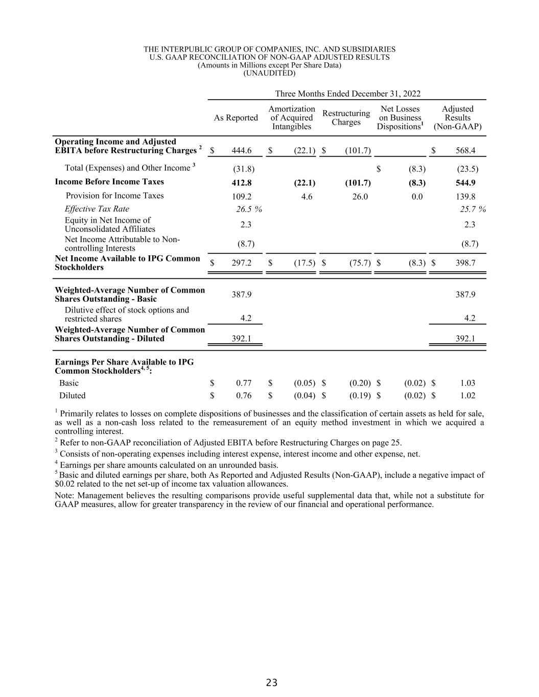 THE INTERPUBLIC GROUP OF COMPANIES, INC. AND SUBSIDIARIES U.S. GAAP RECONCILIATION OF NON-GAAP ADJUSTED RESULTS (Amounts in Millions except Per Share Data) (UNAUDITED) Twelve Months Ended December 31, 2022 As Reported Amortization of Acquired Intangibles Restructuring Charges Net Losses on Businesses Dispositions1 Adjusted Results (Non-GAAP) Operating Income and Adjusted EBITA before Restructuring Charges 2 $ 1,381.2 $ (84.7) $ (102.4) $ 1,568.3 Total (Expenses) and Other Income 3 (112.3) $ (3.8) (108.5) Income Before Income Taxes 1,268.9 (84.7) (102.4) (3.8) 1,459.8 Provision for Income Taxes 318.4 17.3 25.8 0.1 361.6 Effective Tax Rate 25.1 % 24.8 % Equity in Net Income of Unconsolidated Affiliates 5.6 5.6 Net Income Attributable to Non-controlling Interests (18.1) (18.1) Net Income Available to IPG Common Stockholders $ 938.0 $ (67.4) $ (76.6) $ (3.7) $ 1,085.7 Weighted-Average Number of Common Shares Outstanding - Basic 391.5 391.5 Dilutive effect of stock options and restricted shares 3.6 3.6 Weighted-Average Number of Common Shares Outstanding - Diluted 395.1 395.1 Earnings Per Share Available to IPG Common Stockholders4, 5: Basic $ 2.40 $ (0.17) $ (0.20) $ (0.01) $ 2.77 Diluted $ 2.37 $ (0.17) $ (0.19) $ (0.01) $ 2.75 1 Includes a cash gain related to the sale of an equity investment, offset by losses on complete dispositions of businesses and the classification of certain assets as held for sale, a non-cash loss related to the deconsolidation of a previously consolidated subsidiary in which we maintain an equity interest, and a non-cash loss related to remeasurement of an equity method investment in which we acquired a controlling interest. 2 Refer to non-GAAP reconciliation of Adjusted EBITA before Restructuring Charges on page 25. 3 Consists of non-operating expenses including interest expense, interest income and other expense, net. 4 Earnings per share amounts calculated on an unrounded basis. 5 Basic and diluted earnings per share, both As Reported and Adjusted Results (Non-GAAP), include a negative impact of $0.02 related to the net set-up of income tax valuation allowances. Note: Management believes the resulting comparisons provide useful supplemental data that, while not a substitute for GAAP measures, allow for greater transparency in the review of our financial and operational performance. 24