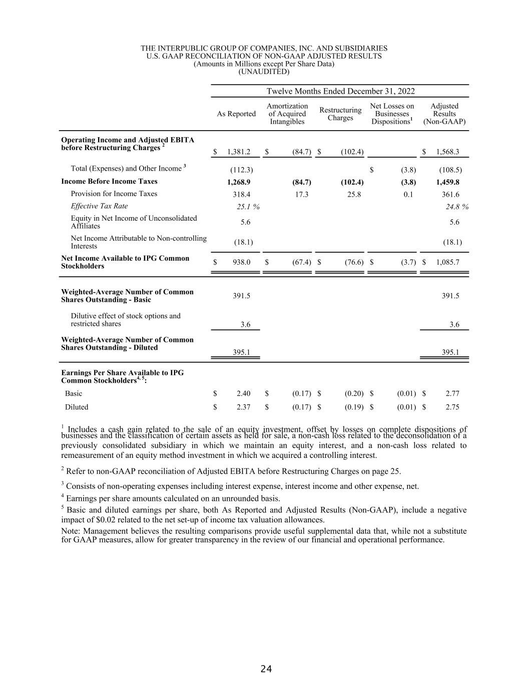 THE INTERPUBLIC GROUP OF COMPANIES, INC. AND SUBSIDIARIES U.S. GAAP RECONCILIATION OF NON-GAAP ADJUSTED RESULTS (Amounts in Millions except Per Share Data) (UNAUDITED) Three Months Ended December 31, 2022 As Reported Amortization of Acquired Intangibles Restructuring Charges Net Losses on Business Dispositions1 Adjusted Results (Non-GAAP) Operating Income and Adjusted EBITA before Restructuring Charges 2 $ 444.6 $ (22.1) $ (101.7) $ 568.4 Total (Expenses) and Other Income 3 (31.8) $ (8.3) (23.5) Income Before Income Taxes 412.8 (22.1) (101.7) (8.3) 544.9 Provision for Income Taxes 109.2 4.6 26.0 0.0 139.8 Effective Tax Rate 26.5 % 25.7 % Equity in Net Income of Unconsolidated Affiliates 2.3 2.3 Net Income Attributable to Non- controlling Interests (8.7) (8.7) Net Income Available to IPG Common Stockholders $ 297.2 $ (17.5) $ (75.7) $ (8.3) $ 398.7 Weighted-Average Number of Common Shares Outstanding - Basic 387.9 387.9 Dilutive effect of stock options and restricted shares 4.2 4.2 Weighted-Average Number of Common Shares Outstanding - Diluted 392.1 392.1 Earnings Per Share Available to IPG Common Stockholders4, 5: Basic $ 0.77 $ (0.05) $ (0.20) $ (0.02) $ 1.03 Diluted $ 0.76 $ (0.04) $ (0.19) $ (0.02) $ 1.02 1 Primarily relates to losses on complete dispositions of businesses and the classification of certain assets as held for sale, as well as a non-cash loss related to the remeasurement of an equity method investment in which we acquired a controlling interest. 2 Refer to non-GAAP reconciliation of Adjusted EBITA before Restructuring Charges on page 25. 3 Consists of non-operating expenses including interest expense, interest income and other expense, net. 4 Earnings per share amounts calculated on an unrounded basis. 5 Basic and diluted earnings per share, both As Reported and Adjusted Results (Non-GAAP), include a negative impact of $0.02 related to the net set-up of income tax valuation allowances. Note: Management believes the resulting comparisons provide useful supplemental data that, while not a substitute for GAAP measures, allow for greater transparency in the review of our financial and operational performance. 23
