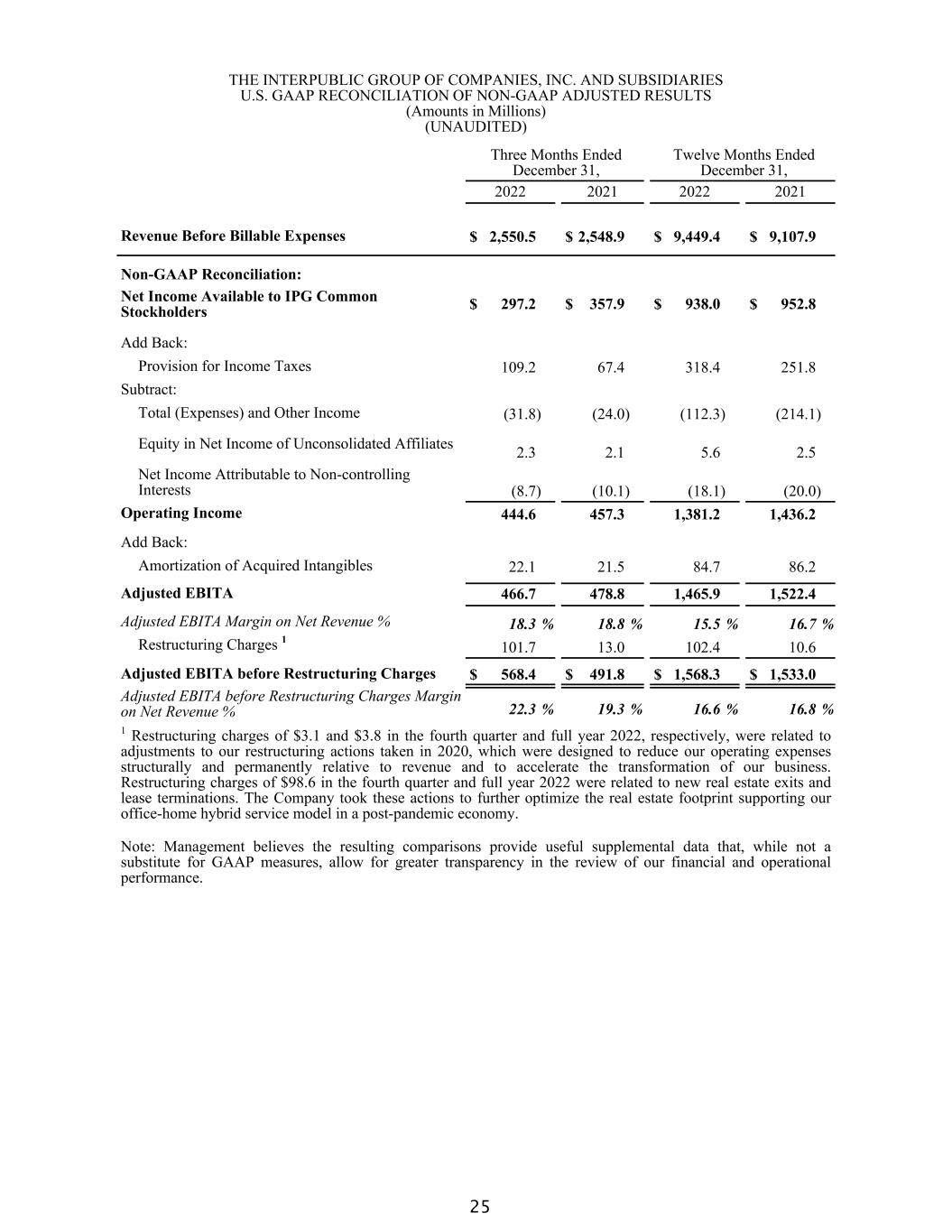 THE INTERPUBLIC GROUP OF COMPANIES, INC. AND SUBSIDIARIES U.S. GAAP RECONCILIATION OF NON-GAAP ADJUSTED RESULTS (Amounts in Millions) (UNAUDITED) Three Months Ended December 31, Twelve Months Ended December 31, 2022 2021 2022 2021 Revenue Before Billable Expenses $ 2,550.5 $ 2,548.9 $ 9,449.4 $ 9,107.9 Non-GAAP Reconciliation: Net Income Available to IPG Common Stockholders $ 297.2 $ 357.9 $ 938.0 $ 952.8 Add Back: Provision for Income Taxes 109.2 67.4 318.4 251.8 Subtract: Total (Expenses) and Other Income (31.8) (24.0) (112.3) (214.1) Equity in Net Income of Unconsolidated Affiliates 2.3 2.1 5.6 2.5 Net Income Attributable to Non-controlling Interests (8.7) (10.1) (18.1) (20.0) Operating Income 444.6 457.3 1,381.2 1,436.2 Add Back: Amortization of Acquired Intangibles 22.1 21.5 84.7 86.2 Adjusted EBITA 466.7 478.8 1,465.9 1,522.4 Adjusted EBITA Margin on Net Revenue % 18.3 % 18.8 % 15.5 % 16.7 % Restructuring Charges 1 101.7 13.0 102.4 10.6 Adjusted EBITA before Restructuring Charges $ 568.4 $ 491.8 $ 1,568.3 $ 1,533.0 Adjusted EBITA before Restructuring Charges Margin on Net Revenue % 22.3 % 19.3 % 16.6 % 16.8 % 1 Restructuring charges of $3.1 and $3.8 in the fourth quarter and full year 2022, respectively, were related to adjustments to our restructuring actions taken in 2020, which were designed to reduce our operating expenses structurally and permanently relative to revenue and to accelerate the transformation of our business. Restructuring charges of $98.6 in the fourth quarter and full year 2022 were related to new real estate exits and lease terminations. The Company took these actions to further optimize the real estate footprint supporting our office-home hybrid service model in a post-pandemic economy. Note: Management believes the resulting comparisons provide useful supplemental data that, while not a substitute for GAAP measures, allow for greater transparency in the review of our financial and operational performance. 25