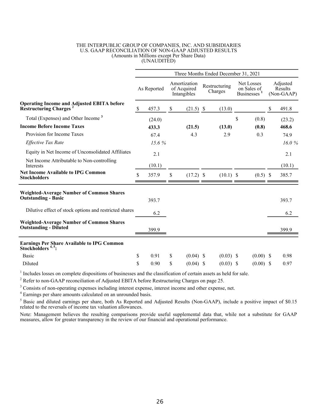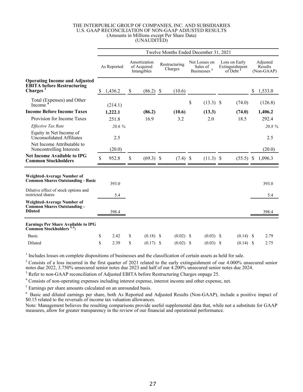 THE INTERPUBLIC GROUP OF COMPANIES, INC. AND SUBSIDIARIES U.S. GAAP RECONCILIATION OF NON-GAAP ADJUSTED RESULTS (Amounts in Millions except Per Share Data) (UNAUDITED) Three Months Ended December 31, 2021 As Reported Amortization of Acquired Intangibles Restructuring Charges Net Losses on Sales of Businesses 1 Adjusted Results (Non-GAAP) Operating Income and Adjusted EBITA before Restructuring Charges 2 $ 457.3 $ (21.5) $ (13.0) $ 491.8 Total (Expenses) and Other Income 3 (24.0) $ (0.8) (23.2) Income Before Income Taxes 433.3 (21.5) (13.0) (0.8) 468.6 Provision for Income Taxes 67.4 4.3 2.9 0.3 74.9 Effective Tax Rate 15.6 % 16.0 % Equity in Net Income of Unconsolidated Affiliates 2.1 2.1 Net Income Attributable to Non-controlling Interests (10.1) (10.1) Net Income Available to IPG Common Stockholders $ 357.9 $ (17.2) $ (10.1) $ (0.5) $ 385.7 Weighted-Average Number of Common Shares Outstanding - Basic 393.7 393.7 Dilutive effect of stock options and restricted shares 6.2 6.2 Weighted-Average Number of Common Shares Outstanding - Diluted 399.9 399.9 Earnings Per Share Available to IPG Common Stockholders 4, 5: Basic $ 0.91 $ (0.04) $ (0.03) $ (0.00) $ 0.98 Diluted $ 0.90 $ (0.04) $ (0.03) $ (0.00) $ 0.97 1 Includes losses on complete dispositions of businesses and the classification of certain assets as held for sale. 2 Refer to non-GAAP reconciliation of Adjusted EBITA before Restructuring Charges on page 25. 3 Consists of non-operating expenses including interest expense, interest income and other expense, net. 4 Earnings per share amounts calculated on an unrounded basis. 5 Basic and diluted earnings per share, both As Reported and Adjusted Results (Non-GAAP), include a positive impact of $0.15 related to the reversals of income tax valuation allowances. Note: Management believes the resulting comparisons provide useful supplemental data that, while not a substitute for GAAP measures, allow for greater transparency in the review of our financial and operational performance. 26