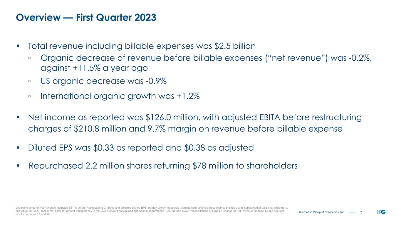 2Interpublic Group of Companies, Inc. Overview — First Quarter 2023 Organic change of Net Revenue, adjusted EBITA before Restructuring Charges and adjusted diluted EPS are non-GAAP measures. Management believes these metrics provide useful supplemental data that, while not a substitute for GAAP measures, allow for greater transparency in the review of our financial and operational performance. See our non-GAAP reconciliations of Organic Change of Net Revenue on page 14 and adjusted results on pages 15 and 18. • Total revenue including billable expenses was $2.5 billion ◦ Organic decrease of revenue before billable expenses (“net revenue”) was -0.2%, against +11.5% a year ago ◦ US organic decrease was -0.9% ◦ International organic growth was +1.2% • Net income as reported was $126.0 million, with adjusted EBITA before restructuring charges of $210.8 million and 9.7% margin on revenue before billable expense • Diluted EPS was $0.33 as reported and $0.38 as adjusted • Repurchased 2.2 million shares returning $78 million to shareholders
