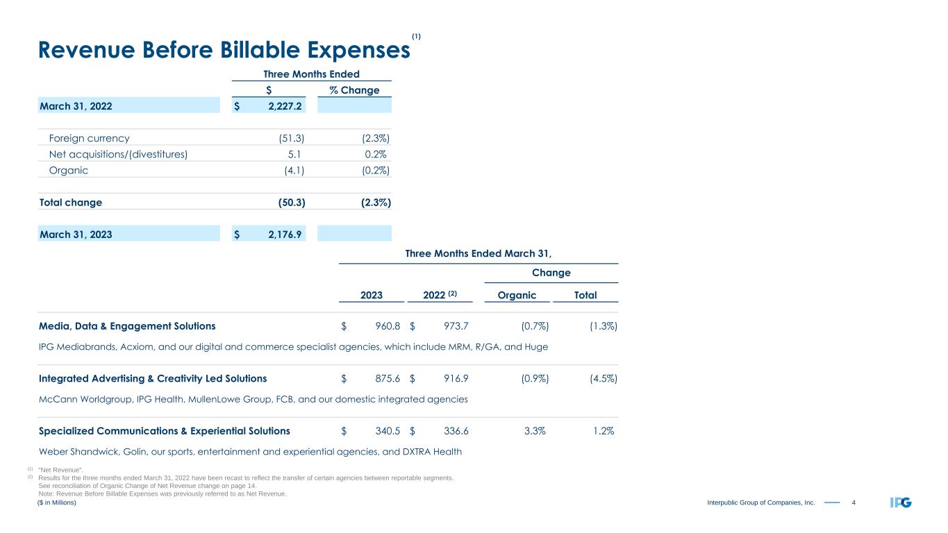4Interpublic Group of Companies, Inc. Three Months Ended March 31, Change 2023 2022 (2) Organic Total Media, Data & Engagement Solutions $ 960.8 $ 973.7 (0.7%) (1.3%) IPG Mediabrands, Acxiom, and our digital and commerce specialist agencies, which include MRM, R/GA, and Huge Integrated Advertising & Creativity Led Solutions $ 875.6 $ 916.9 (0.9%) (4.5%) McCann Worldgroup, IPG Health, MullenLowe Group, FCB, and our domestic integrated agencies Specialized Communications & Experiential Solutions $ 340.5 $ 336.6 3.3% 1.2% Weber Shandwick, Golin, our sports, entertainment and experiential agencies, and DXTRA Health (1) "Net Revenue". (2) Results for the three months ended March 31, 2022 have been recast to reflect the transfer of certain agencies between reportable segments. See reconciliation of Organic Change of Net Revenue change on page 14. Note: Revenue Before Billable Expenses was previously referred to as Net Revenue. ($ in Millions) Revenue Before Billable Expenses Three Months Ended $ % Change March 31, 2022 $ 2,227.2 Foreign currency (51.3) (2.3%) Net acquisitions/(divestitures) 5.1 0.2% Organic (4.1) (0.2%) Total change (50.3) (2.3%) March 31, 2023 $ 2,176.9 (1)