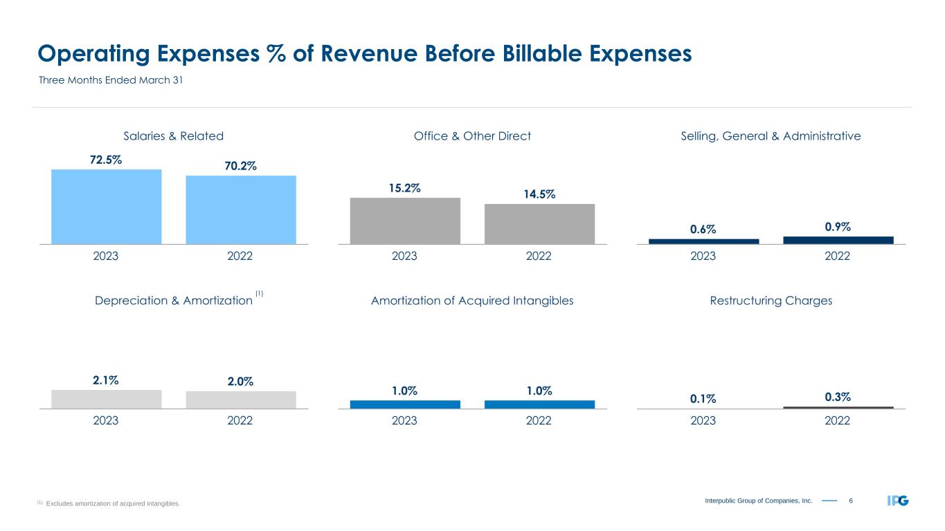 5Interpublic Group of Companies, Inc. Organic Change of Net Revenue by Region Three Months Ended March 31, 2023 -0.9% United States +2.9% United Kingdom -4.0% Continental Europe +3.9% Latin America -2.6% Asia Pacific +1.2% International -0.2% Worldwide +9.3% All Other Markets “All Other Markets” includes Canada, the Middle East and Africa. Circle proportions represent consolidated Net Revenue distribution. See reconciliation of Organic Change of Net Revenue, including total Net Revenue change, on page 14.