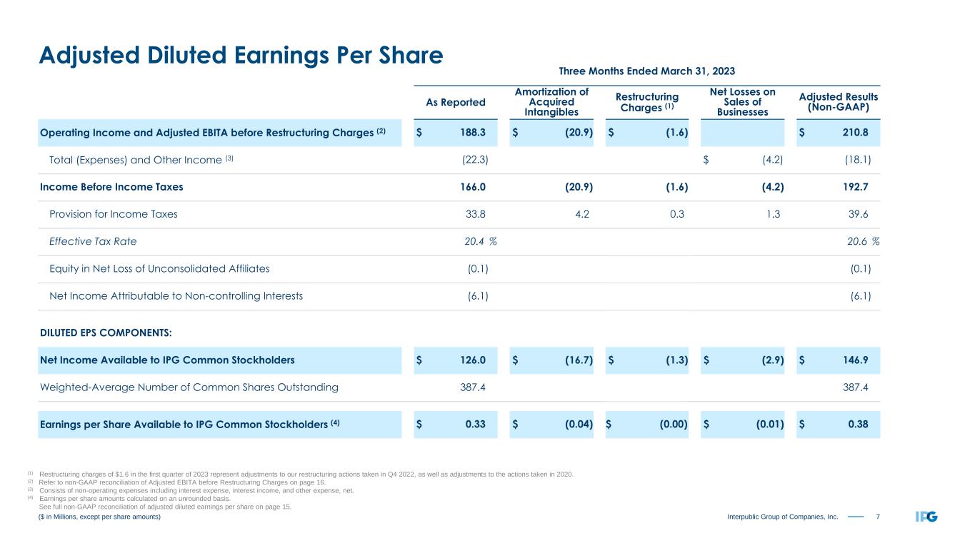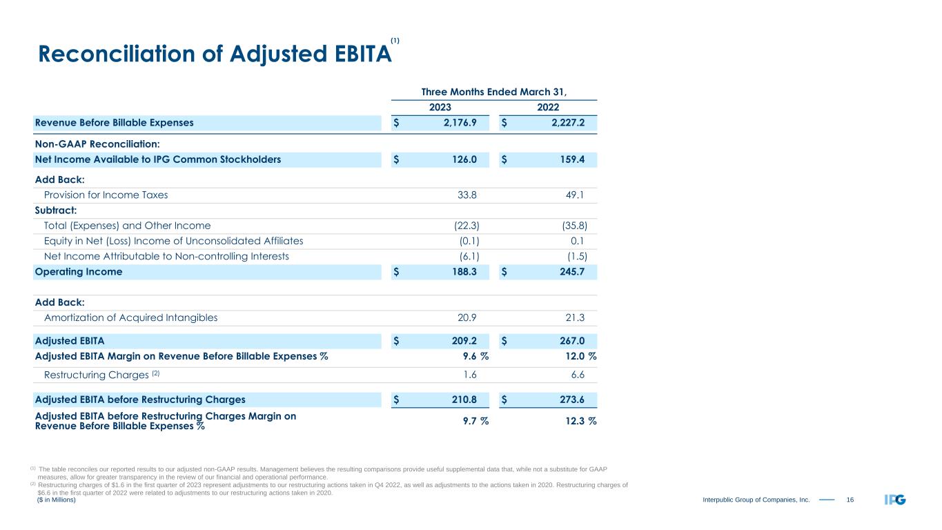15Interpublic Group of Companies, Inc. Three Months Ended March 31, 2023 As Reported Amortization of Acquired Intangibles Restructuring Charges (2) Net Losses on Sales of Businesses Adjusted Results (Non-GAAP) Operating Income and Adjusted EBITA before Restructuring Charges (3) $ 188.3 $ (20.9) $ (1.6) $ 210.8 Total (Expenses) and Other Income (4) (22.3) $ (4.2) (18.1) Income Before Income Taxes 166.0 (20.9) (1.6) (4.2) 192.7 Provision for Income Taxes 33.8 4.2 0.3 1.3 39.6 Effective Tax Rate 20.4 % 20.6 % Equity in Net Loss of Unconsolidated Affiliates (0.1) (0.1) Net Income Attributable to Non-controlling Interests (6.1) (6.1) Net Income Available to IPG Common Stockholders $ 126.0 $ (16.7) $ (1.3) $ (2.9) $ 146.9 Weighted-Average Number of Common Shares Outstanding - Basic 385.8 385.8 Dilutive effect of stock options and restricted shares 1.6 1.6 Weighted-Average Number of Common Shares Outstanding - Diluted 387.4 387.4 Earnings per Share Available to IPG Common Stockholders (5): Basic $ 0.33 $ (0.04) $ (0.00) $ (0.01) $ 0.38 Diluted $ 0.33 $ (0.04) $ (0.00) $ (0.01) $ 0.38 ($ in Millions, except per share amounts) (1) The table reconciles our reported results to our adjusted non-GAAP results. Management believes the resulting comparisons provide useful supplemental data that, while not a substitute for GAAP measures, allow for greater transparency in the review of our financial and operational performance. (2) Restructuring charges of $1.6 in the first quarter of 2023 represent adjustments to our restructuring actions taken in Q4 2022, as well as adjustments to the actions taken in 2020. (3) Refer to non-GAAP reconciliation of Adjusted EBITA before Restructuring Charges on page 16. (4) Consists of non-operating expenses including interest expense, interest income, and other expense, net. (5) Earnings per share amounts calculated on an unrounded basis. Reconciliation of Adjusted Results (1)
