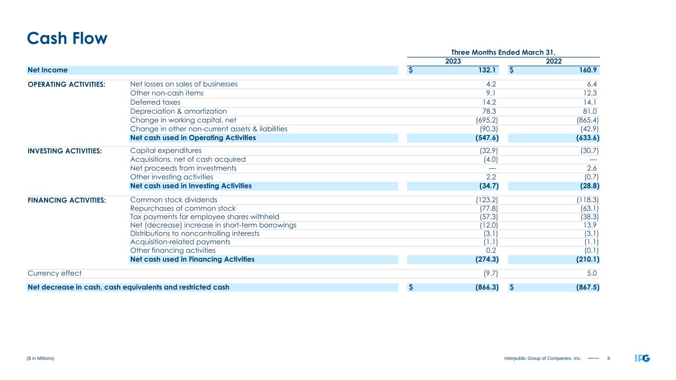 8Interpublic Group of Companies, Inc. Three Months Ended March 31, 2023 2022 Net Income $ 132.1 $ 160.9 OPERATING ACTIVITIES: Net losses on sales of businesses 4.2 6.4 Other non-cash items 9.1 12.3 Deferred taxes 14.2 14.1 Depreciation & amortization 78.3 81.0 Change in working capital, net (695.2) (865.4) Change in other non-current assets & liabilities (90.3) (42.9) Net cash used in Operating Activities (547.6) (633.6) INVESTING ACTIVITIES: Capital expenditures (32.9) (30.7) Acquisitions, net of cash acquired (4.0) — Net proceeds from investments — 2.6 Other investing activities 2.2 (0.7) Net cash used in Investing Activities (34.7) (28.8) FINANCING ACTIVITIES: Common stock dividends (123.2) (118.3) Repurchases of common stock (77.8) (63.1) Tax payments for employee shares withheld (57.3) (38.3) Net (decrease) increase in short-term borrowings (12.0) 13.9 Distributions to noncontrolling interests (3.1) (3.1) Acquisition-related payments (1.1) (1.1) Other financing activities 0.2 (0.1) Net cash used in Financing Activities (274.3) (210.1) Currency effect (9.7) 5.0 Net decrease in cash, cash equivalents and restricted cash $ (866.3) $ (867.5) ($ in Millions) Cash Flow