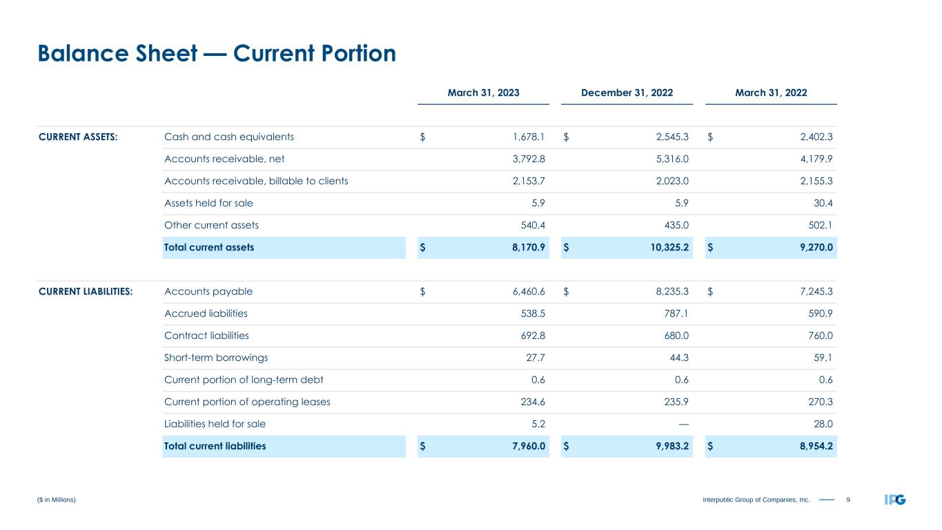 9Interpublic Group of Companies, Inc. March 31, 2023 December 31, 2022 March 31, 2022 CURRENT ASSETS: Cash and cash equivalents $ 1,678.1 $ 2,545.3 $ 2,402.3 Accounts receivable, net 3,792.8 5,316.0 4,179.9 Accounts receivable, billable to clients 2,153.7 2,023.0 2,155.3 Assets held for sale 5.9 5.9 30.4 Other current assets 540.4 435.0 502.1 Total current assets $ 8,170.9 $ 10,325.2 $ 9,270.0 CURRENT LIABILITIES: Accounts payable $ 6,460.6 $ 8,235.3 $ 7,245.3 Accrued liabilities 538.5 787.1 590.9 Contract liabilities 692.8 680.0 760.0 Short-term borrowings 27.7 44.3 59.1 Current portion of long-term debt 0.6 0.6 0.6 Current portion of operating leases 234.6 235.9 270.3 Liabilities held for sale 5.2 — 28.0 Total current liabilities $ 7,960.0 $ 9,983.2 $ 8,954.2 ($ in Millions) Balance Sheet — Current Portion