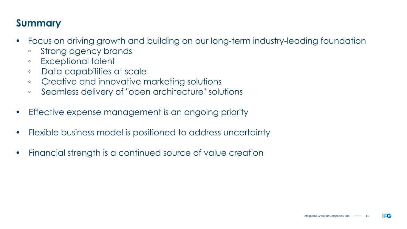 11Interpublic Group of Companies, Inc. Summary • Focus on driving growth and building on our long-term industry-leading foundation ◦ Strong agency brands ◦ Exceptional talent ◦ Data capabilities at scale ◦ Creative and innovative marketing solutions ◦ Seamless delivery of "open architecture" solutions • Effective expense management is an ongoing priority • Flexible business model is positioned to address uncertainty • Financial strength is a continued source of value creation