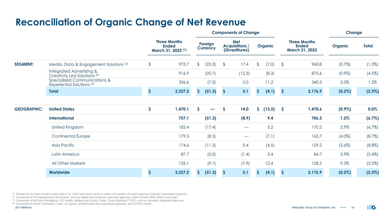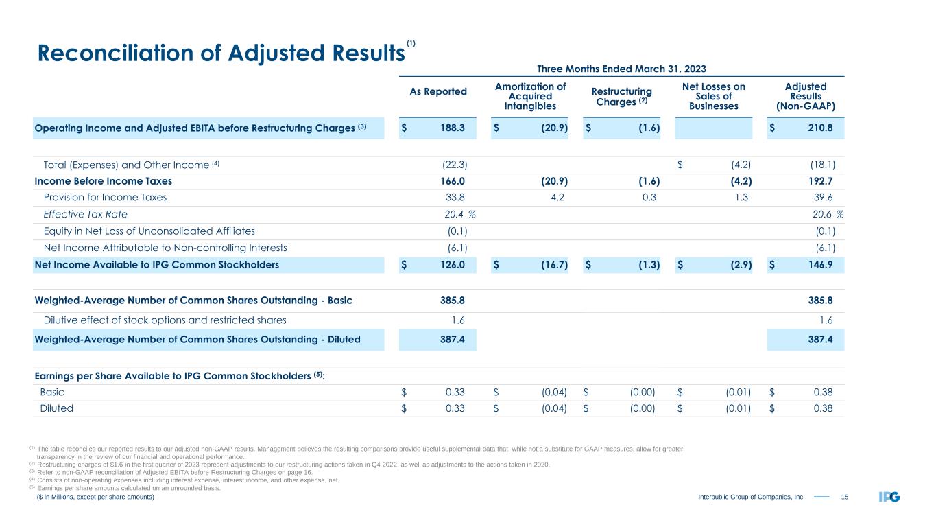 14Interpublic Group of Companies, Inc. Components of Change Change Three Months Ended March 31, 2022 (1) Foreign Currency Net Acquisitions / (Divestitures) Organic Three Months Ended March 31, 2023 Organic Total SEGMENT: Media, Data & Engagement Solutions (2) $ 973.7 $ (23.3) $ 17.4 $ (7.0) $ 960.8 (0.7%) (1.3%) Integrated Advertising & Creativity Led Solutions (3) 916.9 (20.7) (12.3) (8.3) 875.6 (0.9%) (4.5%) Specialized Communications & Experiential Solutions (4) 336.6 (7.3) 0.0 11.2 340.5 3.3% 1.2% Total $ 2,227.2 $ (51.3) $ 5.1 $ (4.1) $ 2,176.9 (0.2%) (2.3%) GEOGRAPHIC: United States $ 1,470.1 $ — $ 14.0 $ (13.5) $ 1,470.6 (0.9%) 0.0% International 757.1 (51.3) (8.9) 9.4 706.3 1.2% (6.7%) United Kingdom 182.4 (17.4) — 5.2 170.2 2.9% (6.7%) Continental Europe 179.3 (8.5) — (7.1) 163.7 (4.0%) (8.7%) Asia Pacific 174.6 (11.3) 0.4 (4.5) 159.2 (2.6%) (8.8%) Latin America 87.7 (5.0) (1.4) 3.4 84.7 3.9% (3.4%) All Other Markets 133.1 (9.1) (7.9) 12.4 128.5 9.3% (3.5%) Worldwide $ 2,227.2 $ (51.3) $ 5.1 $ (4.1) $ 2,176.9 (0.2%) (2.3%) ($ in Millions) Reconciliation of Organic Change of Net Revenue (1) Results for the three months ended March 31, 2022 have been recast to reflect the transfer of certain agencies between reportable segments. (2) Comprised of IPG Mediabrands and Acxiom, and our digital and commerce specialist agencies, which include MRM, R/GA, and Huge. (3) Comprised of McCann Worldgroup, IPG Health, MullenLowe Group, Foote, Cone & Belding ("FCB"), and our domestic integrated agencies. (4) Comprised of Weber Shandwick, Golin, our sports, entertainment and experiential agencies, and DXTRA Health.