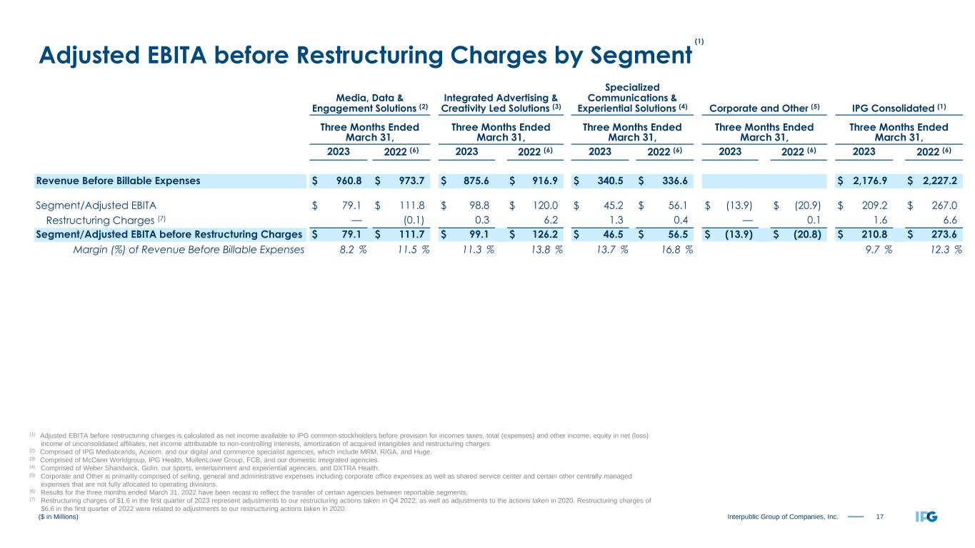 16Interpublic Group of Companies, Inc. Reconciliation of Adjusted EBITA Three Months Ended March 31, 2023 2022 Revenue Before Billable Expenses $ 2,176.9 $ 2,227.2 Non-GAAP Reconciliation: Net Income Available to IPG Common Stockholders $ 126.0 $ 159.4 Add Back: Provision for Income Taxes 33.8 49.1 Subtract: Total (Expenses) and Other Income (22.3) (35.8) Equity in Net (Loss) Income of Unconsolidated Affiliates (0.1) 0.1 Net Income Attributable to Non-controlling Interests (6.1) (1.5) Operating Income $ 188.3 $ 245.7 Add Back: Amortization of Acquired Intangibles 20.9 21.3 Adjusted EBITA $ 209.2 $ 267.0 Adjusted EBITA Margin on Revenue Before Billable Expenses % 9.6 % 12.0 % Restructuring Charges (2) 1.6 6.6 Adjusted EBITA before Restructuring Charges $ 210.8 $ 273.6 Adjusted EBITA before Restructuring Charges Margin on Revenue Before Billable Expenses % 9.7 % 12.3 % (1) ($ in Millions) (1) The table reconciles our reported results to our adjusted non-GAAP results. Management believes the resulting comparisons provide useful supplemental data that, while not a substitute for GAAP measures, allow for greater transparency in the review of our financial and operational performance. (2) Restructuring charges of $1.6 in the first quarter of 2023 represent adjustments to our restructuring actions taken in Q4 2022, as well as adjustments to the actions taken in 2020. Restructuring charges of $6.6 in the first quarter of 2022 were related to adjustments to our restructuring actions taken in 2020.
