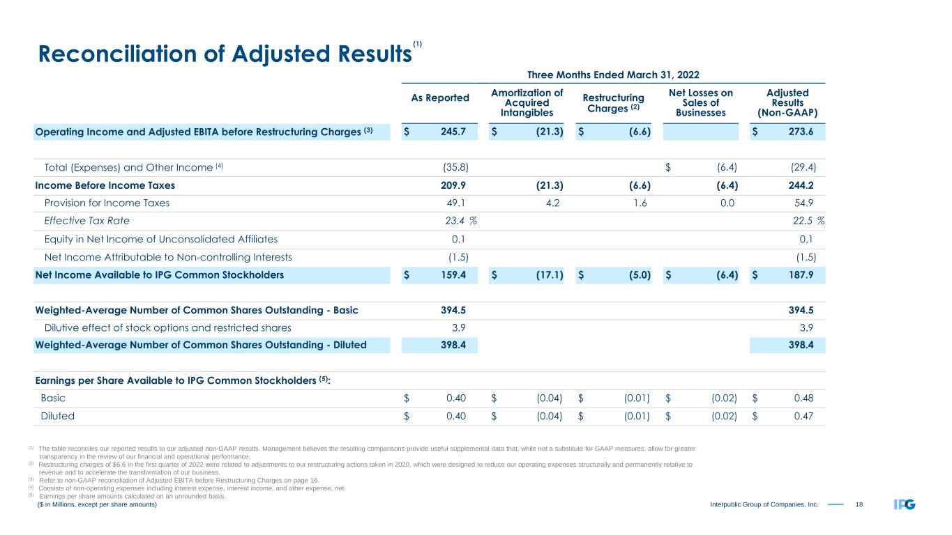 18Interpublic Group of Companies, Inc. Three Months Ended March 31, 2022 As Reported Amortization of Acquired Intangibles Restructuring Charges (2) Net Losses on Sales of Businesses Adjusted Results (Non-GAAP) Operating Income and Adjusted EBITA before Restructuring Charges (3) $ 245.7 $ (21.3) $ (6.6) $ 273.6 Total (Expenses) and Other Income (4) (35.8) $ (6.4) (29.4) Income Before Income Taxes 209.9 (21.3) (6.6) (6.4) 244.2 Provision for Income Taxes 49.1 4.2 1.6 0.0 54.9 Effective Tax Rate 23.4 % 22.5 % Equity in Net Income of Unconsolidated Affiliates 0.1 0.1 Net Income Attributable to Non-controlling Interests (1.5) (1.5) Net Income Available to IPG Common Stockholders $ 159.4 $ (17.1) $ (5.0) $ (6.4) $ 187.9 Weighted-Average Number of Common Shares Outstanding - Basic 394.5 394.5 Dilutive effect of stock options and restricted shares 3.9 3.9 Weighted-Average Number of Common Shares Outstanding - Diluted 398.4 398.4 Earnings per Share Available to IPG Common Stockholders (5): Basic $ 0.40 $ (0.04) $ (0.01) $ (0.02) $ 0.48 Diluted $ 0.40 $ (0.04) $ (0.01) $ (0.02) $ 0.47 ($ in Millions, except per share amounts) (1) The table reconciles our reported results to our adjusted non-GAAP results. Management believes the resulting comparisons provide useful supplemental data that, while not a substitute for GAAP measures, allow for greater transparency in the review of our financial and operational performance. (2) Restructuring charges of $6.6 in the first quarter of 2022 were related to adjustments to our restructuring actions taken in 2020, which were designed to reduce our operating expenses structurally and permanently relative to revenue and to accelerate the transformation of our business. (3) Refer to non-GAAP reconciliation of Adjusted EBITA before Restructuring Charges on page 16. (4) Consists of non-operating expenses including interest expense, interest income, and other expense, net. (5) Earnings per share amounts calculated on an unrounded basis. Reconciliation of Adjusted Results (1)