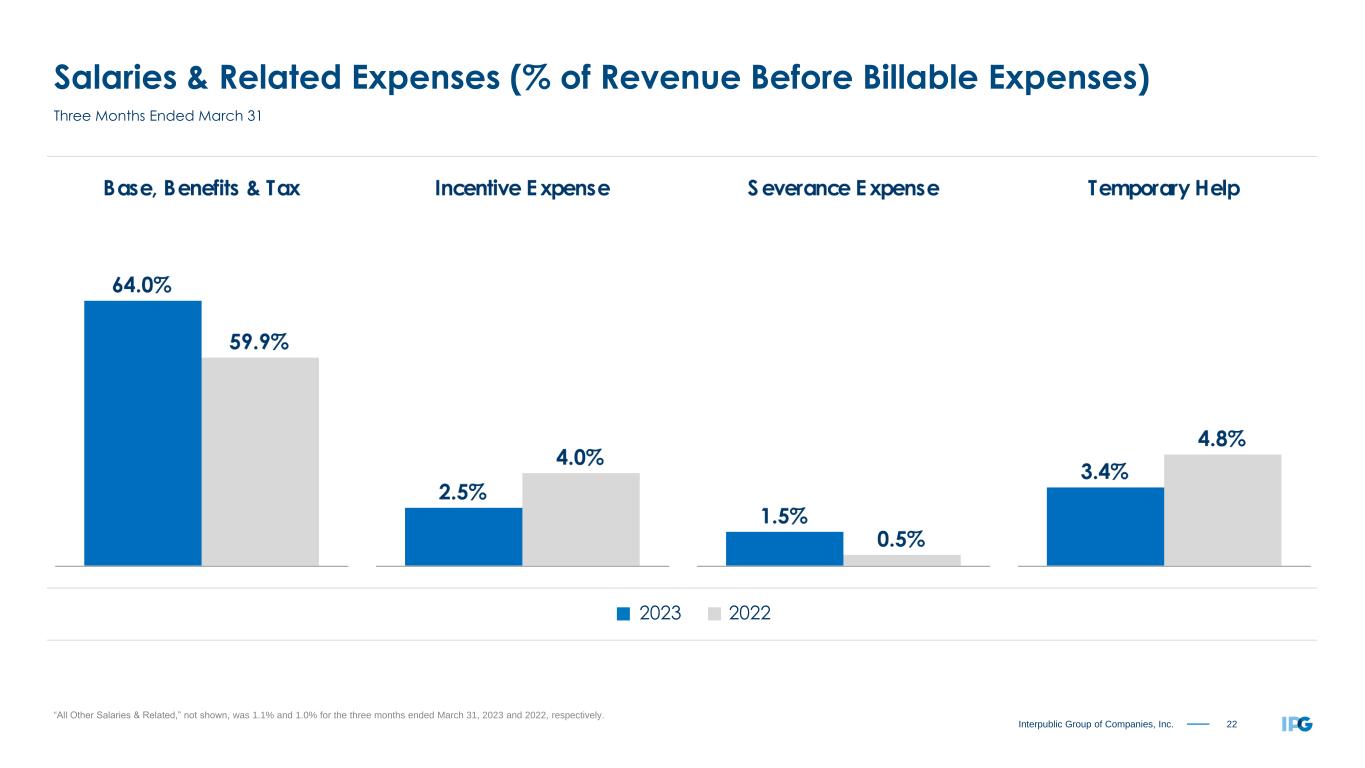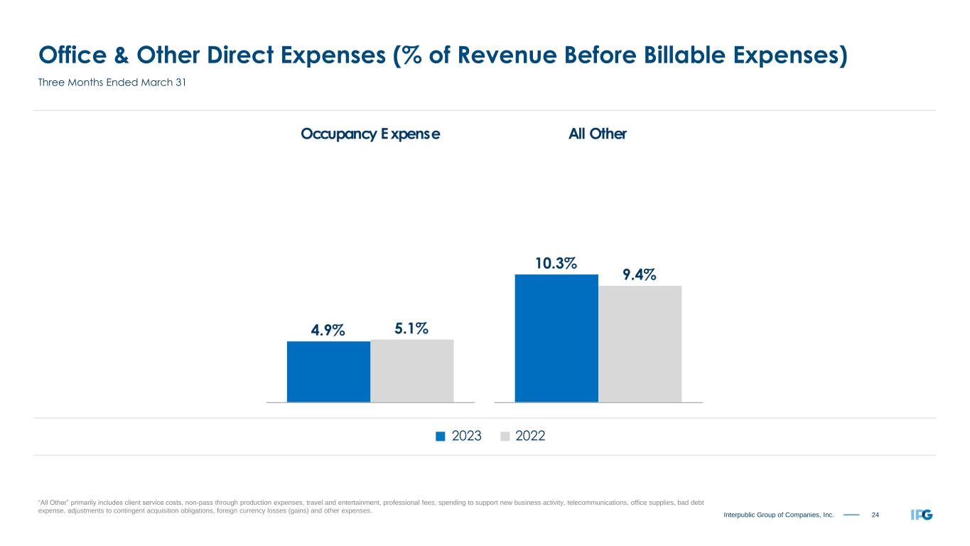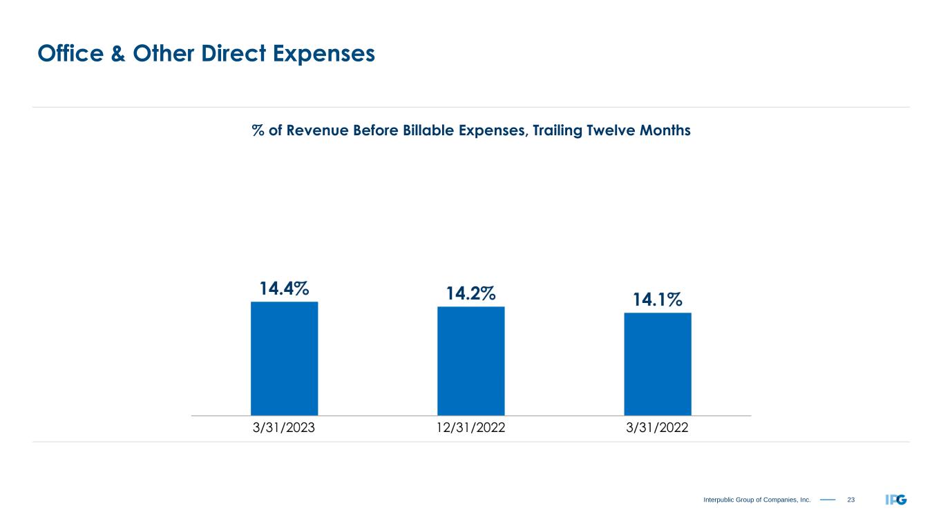 22Interpublic Group of Companies, Inc. Salaries & Related Expenses (% of Revenue Before Billable Expenses) “All Other Salaries & Related,” not shown, was 1.1% and 1.0% for the three months ended March 31, 2023 and 2022, respectively. Three Months Ended March 31 2023 2022