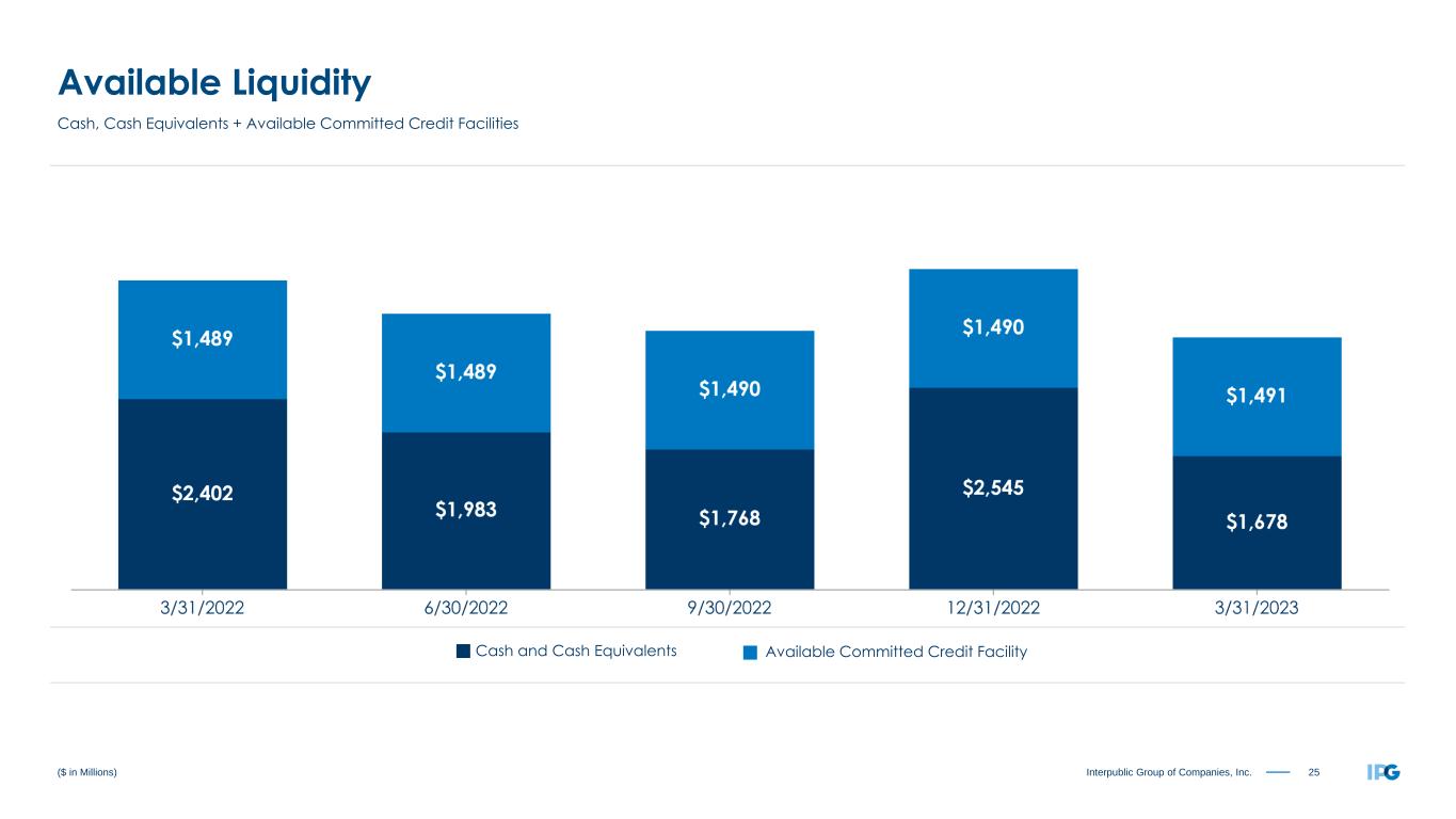 24Interpublic Group of Companies, Inc. Office & Other Direct Expenses (% of Revenue Before Billable Expenses) “All Other” primarily includes client service costs, non-pass through production expenses, travel and entertainment, professional fees, spending to support new business activity, telecommunications, office supplies, bad debt expense, adjustments to contingent acquisition obligations, foreign currency losses (gains) and other expenses. 2023 2022 Three Months Ended March 31