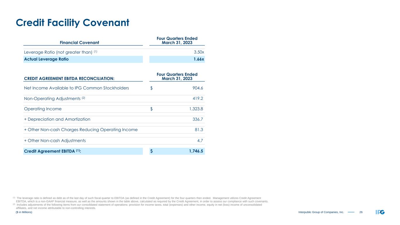 26Interpublic Group of Companies, Inc. Financial Covenant Four Quarters Ended March 31, 2023 Leverage Ratio (not greater than) (1) 3.50x Actual Leverage Ratio 1.66x CREDIT AGREEMENT EBITDA RECONCILIATION: Four Quarters Ended March 31, 2023 Net Income Available to IPG Common Stockholders $ 904.6 Non-Operating Adjustments (2) 419.2 Operating Income $ 1,323.8 + Depreciation and Amortization 336.7 + Other Non-cash Charges Reducing Operating Income 81.3 + Other Non-cash Adjustments 4.7 Credit Agreement EBITDA (1): $ 1,746.5 ($ in Millions) Credit Facility Covenant (1) The leverage ratio is defined as debt as of the last day of such fiscal quarter to EBITDA (as defined in the Credit Agreement) for the four quarters then ended. Management utilizes Credit Agreement EBITDA, which is a non-GAAP financial measure, as well as the amounts shown in the table above, calculated as required by the Credit Agreement, in order to assess our compliance with such covenants. (2) Includes adjustments of the following items from our consolidated statement of operations: provision for income taxes, total (expenses) and other income, equity in net (loss) income of unconsolidated affiliates, and net income attributable to non-controlling interests.