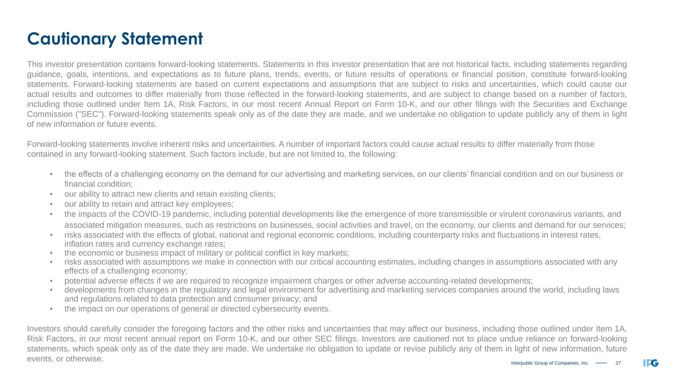 27Interpublic Group of Companies, Inc. Cautionary Statement This investor presentation contains forward-looking statements. Statements in this investor presentation that are not historical facts, including statements regarding guidance, goals, intentions, and expectations as to future plans, trends, events, or future results of operations or financial position, constitute forward-looking statements. Forward-looking statements are based on current expectations and assumptions that are subject to risks and uncertainties, which could cause our actual results and outcomes to differ materially from those reflected in the forward-looking statements, and are subject to change based on a number of factors, including those outlined under Item 1A, Risk Factors, in our most recent Annual Report on Form 10-K, and our other filings with the Securities and Exchange Commission ("SEC"). Forward-looking statements speak only as of the date they are made, and we undertake no obligation to update publicly any of them in light of new information or future events. Forward-looking statements involve inherent risks and uncertainties. A number of important factors could cause actual results to differ materially from those contained in any forward-looking statement. Such factors include, but are not limited to, the following: ▪ the effects of a challenging economy on the demand for our advertising and marketing services, on our clients’ financial condition and on our business or financial condition; ▪ our ability to attract new clients and retain existing clients; ▪ our ability to retain and attract key employees; ▪ the impacts of the COVID-19 pandemic, including potential developments like the emergence of more transmissible or virulent coronavirus variants, and associated mitigation measures, such as restrictions on businesses, social activities and travel, on the economy, our clients and demand for our services; ▪ risks associated with the effects of global, national and regional economic conditions, including counterparty risks and fluctuations in interest rates, inflation rates and currency exchange rates; ▪ the economic or business impact of military or political conflict in key markets; ▪ risks associated with assumptions we make in connection with our critical accounting estimates, including changes in assumptions associated with any effects of a challenging economy; ▪ potential adverse effects if we are required to recognize impairment charges or other adverse accounting-related developments; ▪ developments from changes in the regulatory and legal environment for advertising and marketing services companies around the world, including laws and regulations related to data protection and consumer privacy; and ▪ the impact on our operations of general or directed cybersecurity events. Investors should carefully consider the foregoing factors and the other risks and uncertainties that may affect our business, including those outlined under Item 1A, Risk Factors, in our most recent annual report on Form 10-K, and our other SEC filings. Investors are cautioned not to place undue reliance on forward-looking statements, which speak only as of the date they are made. We undertake no obligation to update or revise publicly any of them in light of new information, future events, or otherwise.