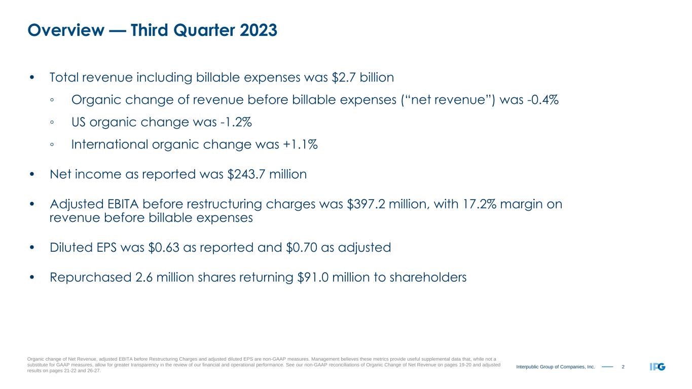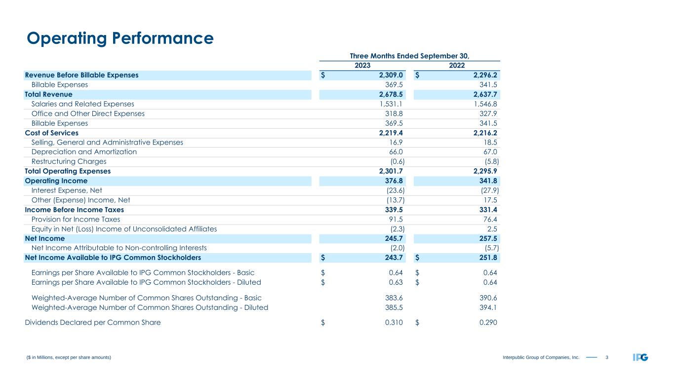 2Interpublic Group of Companies, Inc. Overview — Third Quarter 2023 Organic change of Net Revenue, adjusted EBITA before Restructuring Charges and adjusted diluted EPS are non-GAAP measures. Management believes these metrics provide useful supplemental data that, while not a substitute for GAAP measures, allow for greater transparency in the review of our financial and operational performance. See our non-GAAP reconciliations of Organic Change of Net Revenue on pages 19-20 and adjusted results on pages 21-22 and 26-27. • Total revenue including billable expenses was $2.7 billion ◦ Organic change of revenue before billable expenses (“net revenue”) was -0.4% ◦ US organic change was -1.2% ◦ International organic change was +1.1% • Net income as reported was $243.7 million • Adjusted EBITA before restructuring charges was $397.2 million, with 17.2% margin on revenue before billable expenses • Diluted EPS was $0.63 as reported and $0.70 as adjusted • Repurchased 2.6 million shares returning $91.0 million to shareholders
