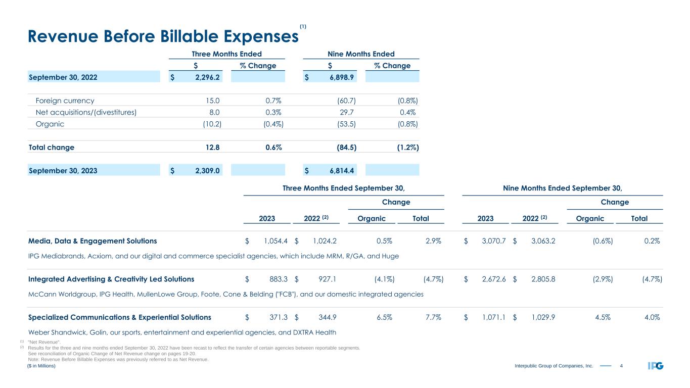 4Interpublic Group of Companies, Inc. Three Months Ended September 30, Nine Months Ended September 30, Change Change 2023 2022 (2) Organic Total 2023 2022 (2) Organic Total Media, Data & Engagement Solutions $ 1,054.4 $ 1,024.2 0.5% 2.9% $ 3,070.7 $ 3,063.2 (0.6%) 0.2% IPG Mediabrands, Acxiom, and our digital and commerce specialist agencies, which include MRM, R/GA, and Huge Integrated Advertising & Creativity Led Solutions $ 883.3 $ 927.1 (4.1%) (4.7%) $ 2,672.6 $ 2,805.8 (2.9%) (4.7%) McCann Worldgroup, IPG Health, MullenLowe Group, Foote, Cone & Belding ("FCB"), and our domestic integrated agencies Specialized Communications & Experiential Solutions $ 371.3 $ 344.9 6.5% 7.7% $ 1,071.1 $ 1,029.9 4.5% 4.0% Weber Shandwick, Golin, our sports, entertainment and experiential agencies, and DXTRA Health (1) "Net Revenue". (2) Results for the three and nine months ended September 30, 2022 have been recast to reflect the transfer of certain agencies between reportable segments. See reconciliation of Organic Change of Net Revenue change on pages 19-20. Note: Revenue Before Billable Expenses was previously referred to as Net Revenue. ($ in Millions) Revenue Before Billable Expenses Three Months Ended Nine Months Ended $ % Change $ % Change September 30, 2022 $ 2,296.2 $ 6,898.9 Foreign currency 15.0 0.7% (60.7) (0.8%) Net acquisitions/(divestitures) 8.0 0.3% 29.7 0.4% Organic (10.2) (0.4%) (53.5) (0.8%) Total change 12.8 0.6% (84.5) (1.2%) September 30, 2023 $ 2,309.0 $ 6,814.4 (1)