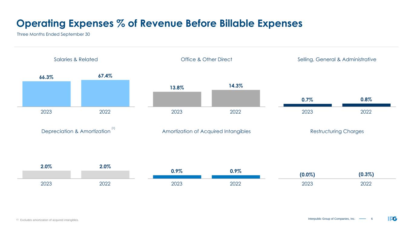 5Interpublic Group of Companies, Inc. Organic Change of Net Revenue by Region Three Months Ended September 30, 2023 -1.2% United States +2.2% United Kingdom +3.9% Continental Europe +5.7% Latin America -5.0% Asia Pacific +1.1% International -0.4% Worldwide +1.2% All Other Markets “All Other Markets” includes Canada, the Middle East and Africa. Circle proportions represent consolidated Net Revenue distribution. See reconciliation of Organic Change of Net Revenue, including total Net Revenue change, on page 19.