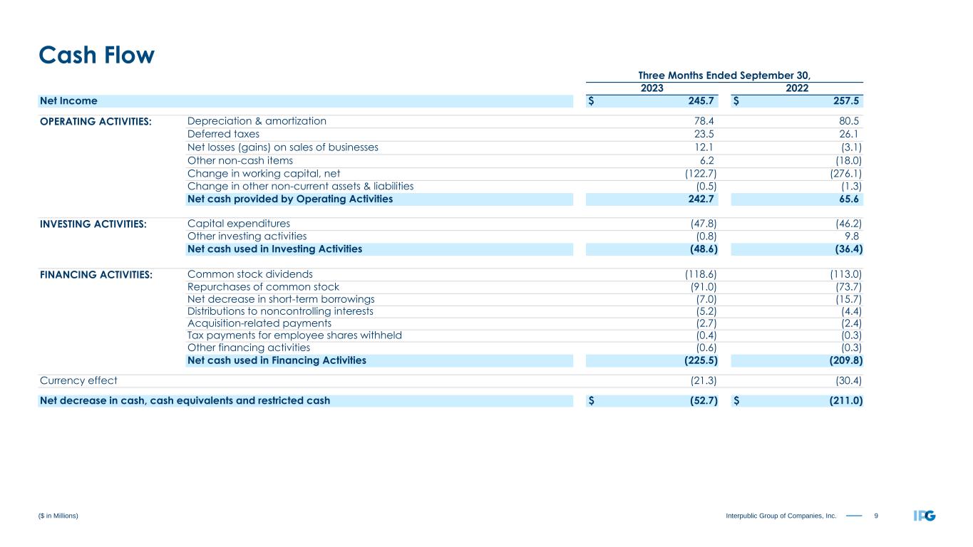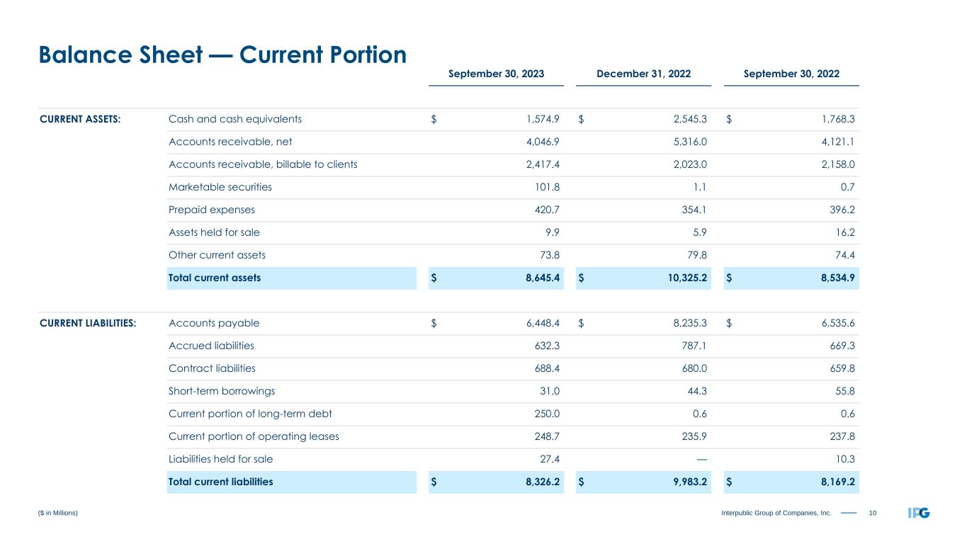 9Interpublic Group of Companies, Inc. Three Months Ended September 30, 2023 2022 Net Income $ 245.7 $ 257.5 OPERATING ACTIVITIES: Depreciation & amortization 78.4 80.5 Deferred taxes 23.5 26.1 Net losses (gains) on sales of businesses 12.1 (3.1) Other non-cash items 6.2 (18.0) Change in working capital, net (122.7) (276.1) Change in other non-current assets & liabilities (0.5) (1.3) Net cash provided by Operating Activities 242.7 65.6 INVESTING ACTIVITIES: Capital expenditures (47.8) (46.2) Other investing activities (0.8) 9.8 Net cash used in Investing Activities (48.6) (36.4) FINANCING ACTIVITIES: Common stock dividends (118.6) (113.0) Repurchases of common stock (91.0) (73.7) Net decrease in short-term borrowings (7.0) (15.7) Distributions to noncontrolling interests (5.2) (4.4) Acquisition-related payments (2.7) (2.4) Tax payments for employee shares withheld (0.4) (0.3) Other financing activities (0.6) (0.3) Net cash used in Financing Activities (225.5) (209.8) Currency effect (21.3) (30.4) Net decrease in cash, cash equivalents and restricted cash $ (52.7) $ (211.0) ($ in Millions) Cash Flow