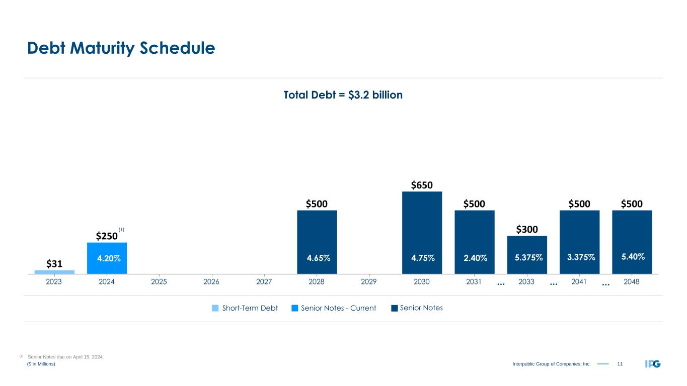 10Interpublic Group of Companies, Inc. September 30, 2023 December 31, 2022 September 30, 2022 CURRENT ASSETS: Cash and cash equivalents $ 1,574.9 $ 2,545.3 $ 1,768.3 Accounts receivable, net 4,046.9 5,316.0 4,121.1 Accounts receivable, billable to clients 2,417.4 2,023.0 2,158.0 Marketable securities 101.8 1.1 0.7 Prepaid expenses 420.7 354.1 396.2 Assets held for sale 9.9 5.9 16.2 Other current assets 73.8 79.8 74.4 Total current assets $ 8,645.4 $ 10,325.2 $ 8,534.9 CURRENT LIABILITIES: Accounts payable $ 6,448.4 $ 8,235.3 $ 6,535.6 Accrued liabilities 632.3 787.1 669.3 Contract liabilities 688.4 680.0 659.8 Short-term borrowings 31.0 44.3 55.8 Current portion of long-term debt 250.0 0.6 0.6 Current portion of operating leases 248.7 235.9 237.8 Liabilities held for sale 27.4 — 10.3 Total current liabilities $ 8,326.2 $ 9,983.2 $ 8,169.2 ($ in Millions) Balance Sheet — Current Portion