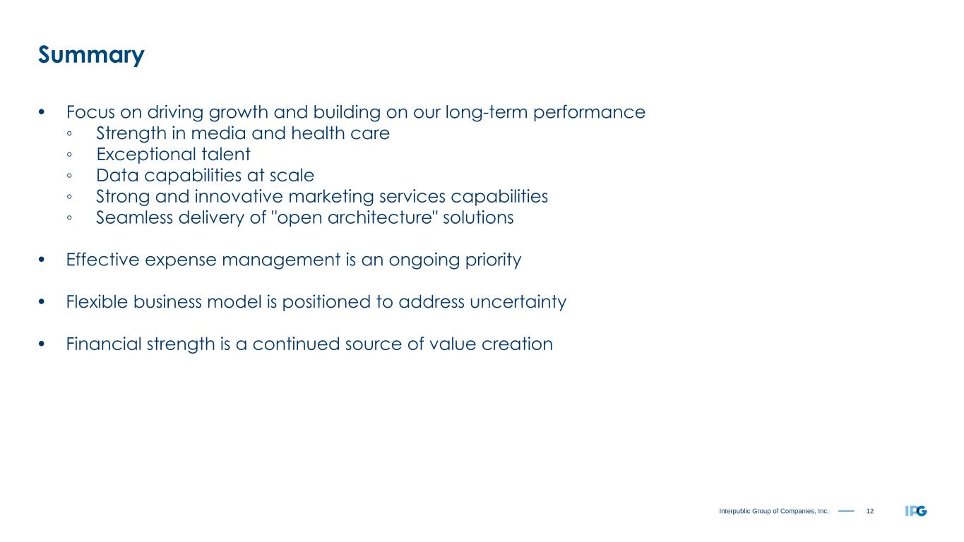 12Interpublic Group of Companies, Inc. Summary • Focus on driving growth and building on our long-term performance ◦ Strength in media and health care ◦ Exceptional talent ◦ Data capabilities at scale ◦ Strong and innovative marketing services capabilities ◦ Seamless delivery of "open architecture" solutions • Effective expense management is an ongoing priority • Flexible business model is positioned to address uncertainty • Financial strength is a continued source of value creation