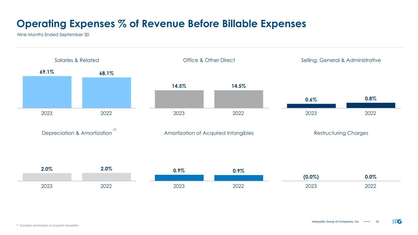 15Interpublic Group of Companies, Inc. Organic Change of Net Revenue by Region “All Other Markets” includes Canada, the Middle East and Africa. Circle proportions represent consolidated Net Revenue distribution. See reconciliation of Organic Change of Net Revenue, including total Net Revenue change, on page 20. Nine Months Ended September 30, 2023 -1.6% United States +2.2% United Kingdom -1.7% Continental Europe +5.4% Latin America -3.3% Asia Pacific +0.7% International -0.8% Worldwide +3.9% All Other Markets