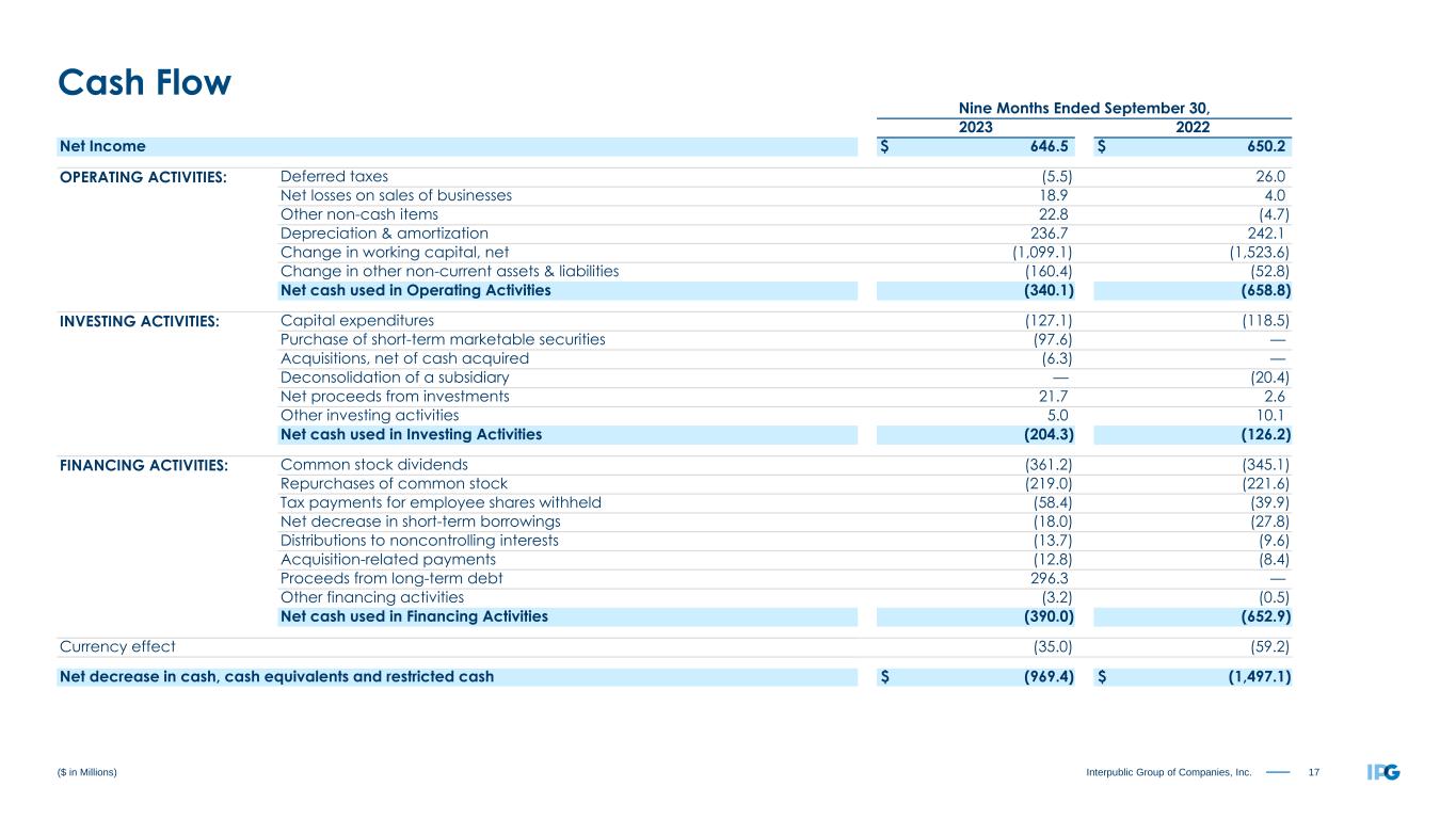 17Interpublic Group of Companies, Inc. Nine Months Ended September 30, 2023 2022 Net Income $ 646.5 $ 650.2 OPERATING ACTIVITIES: Deferred taxes (5.5) 26.0 Net losses on sales of businesses 18.9 4.0 Other non-cash items 22.8 (4.7) Depreciation & amortization 236.7 242.1 Change in working capital, net (1,099.1) (1,523.6) Change in other non-current assets & liabilities (160.4) (52.8) Net cash used in Operating Activities (340.1) (658.8) INVESTING ACTIVITIES: Capital expenditures (127.1) (118.5) Purchase of short-term marketable securities (97.6) — Acquisitions, net of cash acquired (6.3) — Deconsolidation of a subsidiary — (20.4) Net proceeds from investments 21.7 2.6 Other investing activities 5.0 10.1 Net cash used in Investing Activities (204.3) (126.2) FINANCING ACTIVITIES: Common stock dividends (361.2) (345.1) Repurchases of common stock (219.0) (221.6) Tax payments for employee shares withheld (58.4) (39.9) Net decrease in short-term borrowings (18.0) (27.8) Distributions to noncontrolling interests (13.7) (9.6) Acquisition-related payments (12.8) (8.4) Proceeds from long-term debt 296.3 — Other financing activities (3.2) (0.5) Net cash used in Financing Activities (390.0) (652.9) Currency effect (35.0) (59.2) Net decrease in cash, cash equivalents and restricted cash $ (969.4) $ (1,497.1) ($ in Millions) Cash Flow