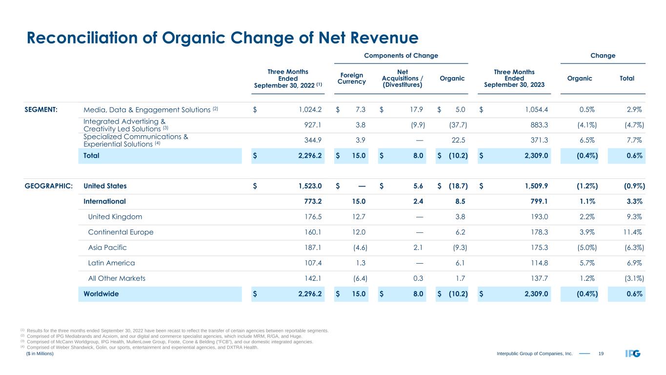 20Interpublic Group of Companies, Inc. ($ in Millions) Components of Change Change Nine Months Ended September 30, 2022 (1) Foreign Currency Net Acquisitions / (Divestitures) Organic Nine Months Ended September 30, 2023 Organic Total SEGMENT: Media, Data & Engagement Solutions (2) $ 3,063.2 $ (28.7) $ 54.0 $ (17.8) $ 3,070.7 (0.6%) 0.2% Integrated Advertising & Creativity Led Solutions (3) 2,805.8 (26.5) (24.3) (82.4) 2,672.6 (2.9%) (4.7%) Specialized Communications & Experiential Solutions (4) 1,029.9 (5.5) — 46.7 1,071.1 4.5% 4.0% Total $ 6,898.9 $ (60.7) $ 29.7 $ (53.5) $ 6,814.4 (0.8%) (1.2%) GEOGRAPHIC: United States $ 4,548.0 $ — $ 35.1 $ (70.8) $ 4,512.3 (1.6%) (0.8%) International 2,350.9 (60.7) (5.4) 17.3 2,302.1 0.7% (2.1%) United Kingdom 543.7 (7.8) — 12.2 548.1 2.2% 0.8% Continental Europe 539.2 4.7 — (9.4) 534.5 (1.7%) (0.9%) Asia Pacific 549.5 (24.0) 4.2 (17.9) 511.8 (3.3%) (6.9%) Latin America 297.0 (9.6) (1.4) 15.9 301.9 5.4% 1.6% All Other Markets 421.5 (24.0) (8.2) 16.5 405.8 3.9% (3.7%) Worldwide $ 6,898.9 $ (60.7) $ 29.7 $ (53.5) $ 6,814.4 (0.8%) (1.2%) Reconciliation of Organic Change of Net Revenue (1) Results for the nine months ended September 30, 2022 have been recast to reflect the transfer of certain agencies between reportable segments. (2) Comprised of IPG Mediabrands and Acxiom, and our digital and commerce specialist agencies, which include MRM, R/GA, and Huge. (3) Comprised of McCann Worldgroup, IPG Health, MullenLowe Group, Foote, Cone & Belding ("FCB"), and our domestic integrated agencies. (4) Comprised of Weber Shandwick, Golin, our sports, entertainment and experiential agencies, and DXTRA Health.